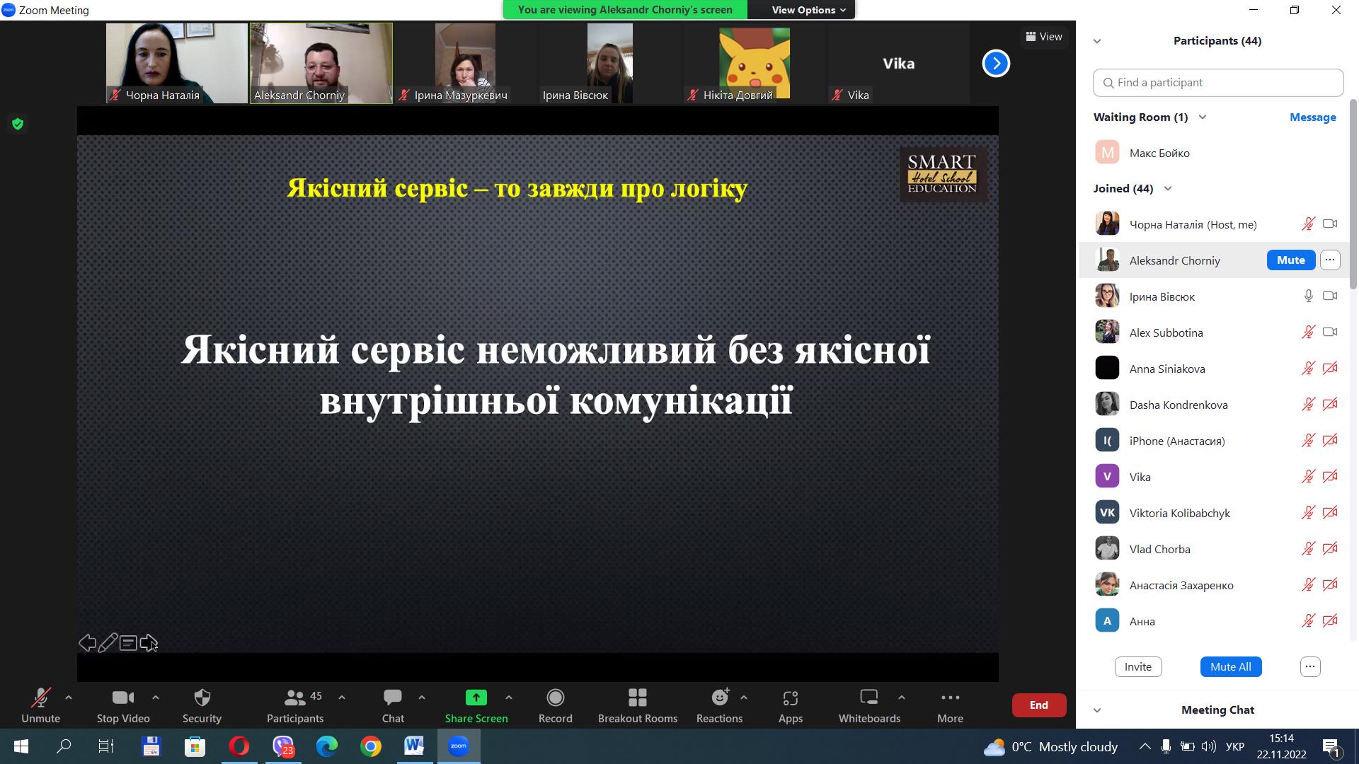 22 листопада 2022 року для здобувачів вищої освіти за спеціальностями 241 «Готельно-ресторанна справа», 242 «Туризм» було проведено семінар на тему «Управління сервісом та комунікацією в готелі», спікером на якому виступив Олександр Чорний, сертифікований бізнес-тренер, експерт із сервісної комунікації, керівник та засновник Smart Education Hotel School.