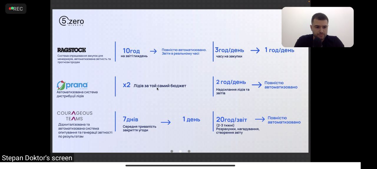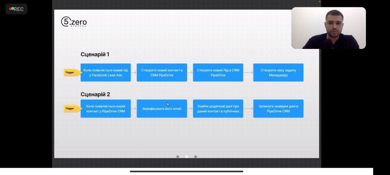 Детально розглянули тему інструментів no-code, їхні переваги та інструменти, якими можна почати користуватися одразу. У якості практичного тренінгу під час вебінару тренер автоматизував консолідацію потенційних клієнтів у CRM із кількох джерел.