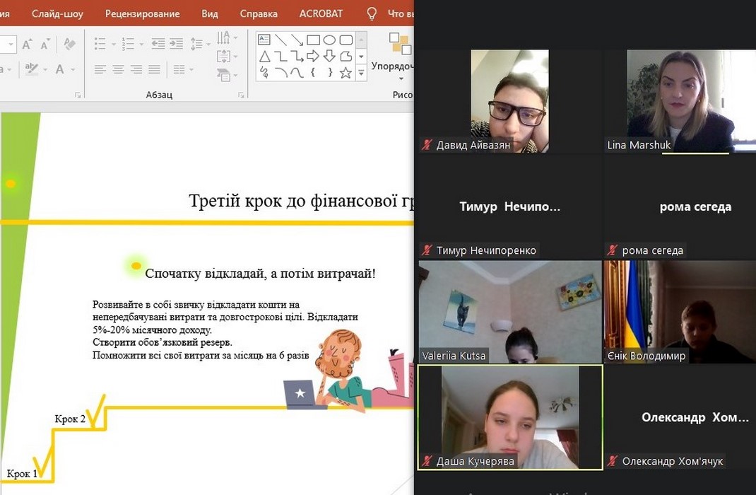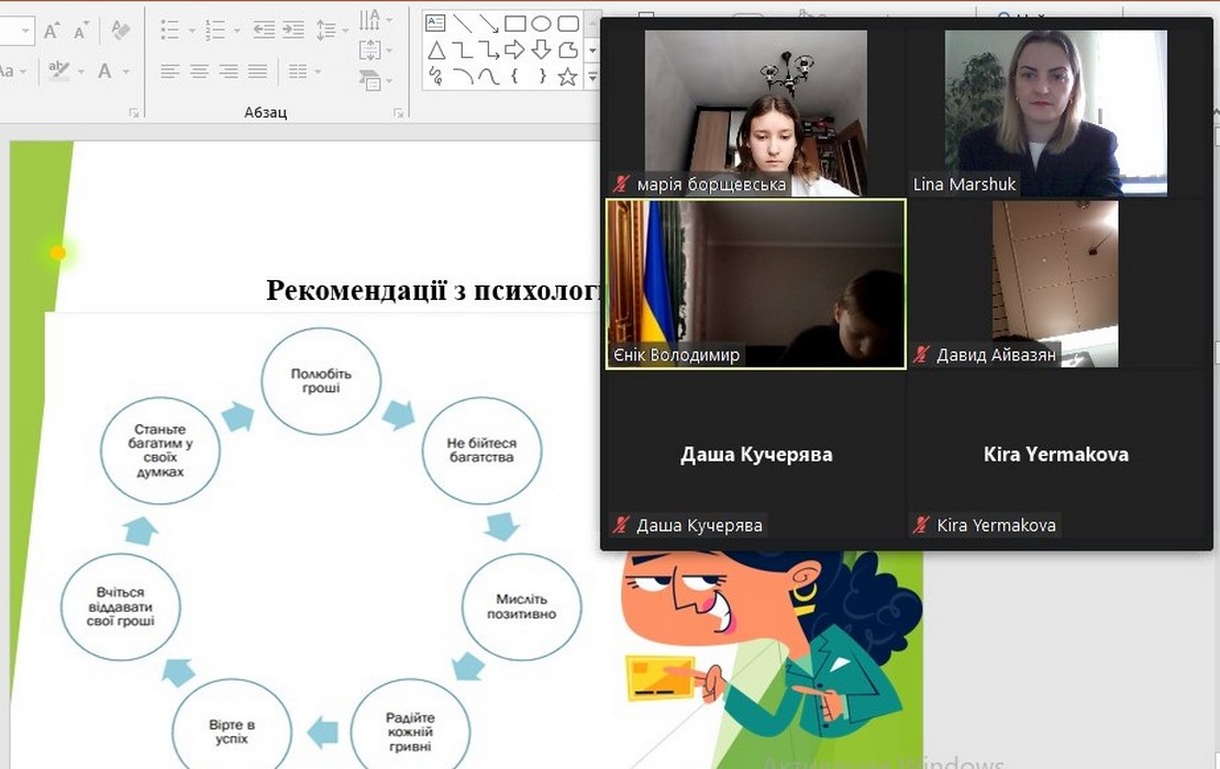 7 грудня 2022 року для учнів 9-Е класу КЗ «Вінницький ліцей №7 ім. Олександра Сухомовського» доцент кафедри фінансів Ліна Маршук провела в онлайн режимі практичне заняття «Фінансова грамотність». Мета заходу - вивчення основних елементів фінансової грамотності та їх практичного застосування.