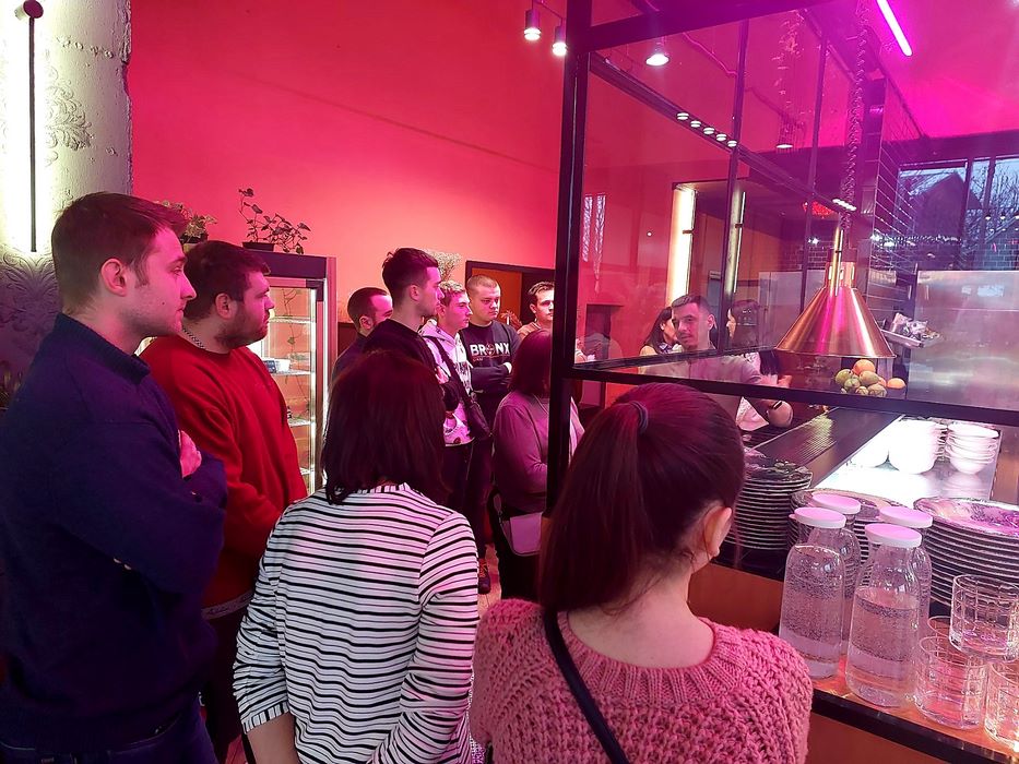 Значну увагу було приділено меню, розробленому шеф-кухарем ресторану Віталієм Сапотніцьким, та новітнім технологіям приготування страв. Пан Віталій поділився зі здобувачами вищої освіти секретами організації бізнес-процесу щодо виробництва ресторанної продукції. Усі охочі мали можливість спостерігати за злагодженою роботою кухарів на відкритій кухні, їх взаємодією у виробничому просторі з незмінним дотриманням вимог стандартів з якості та безпечності харчової продукції.