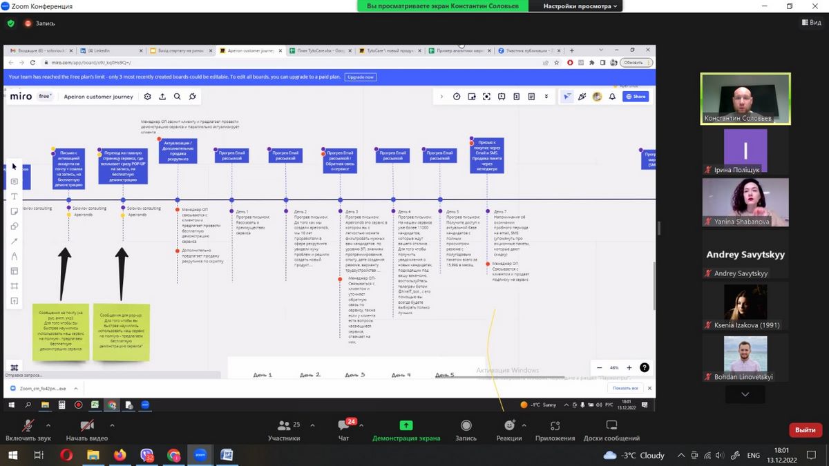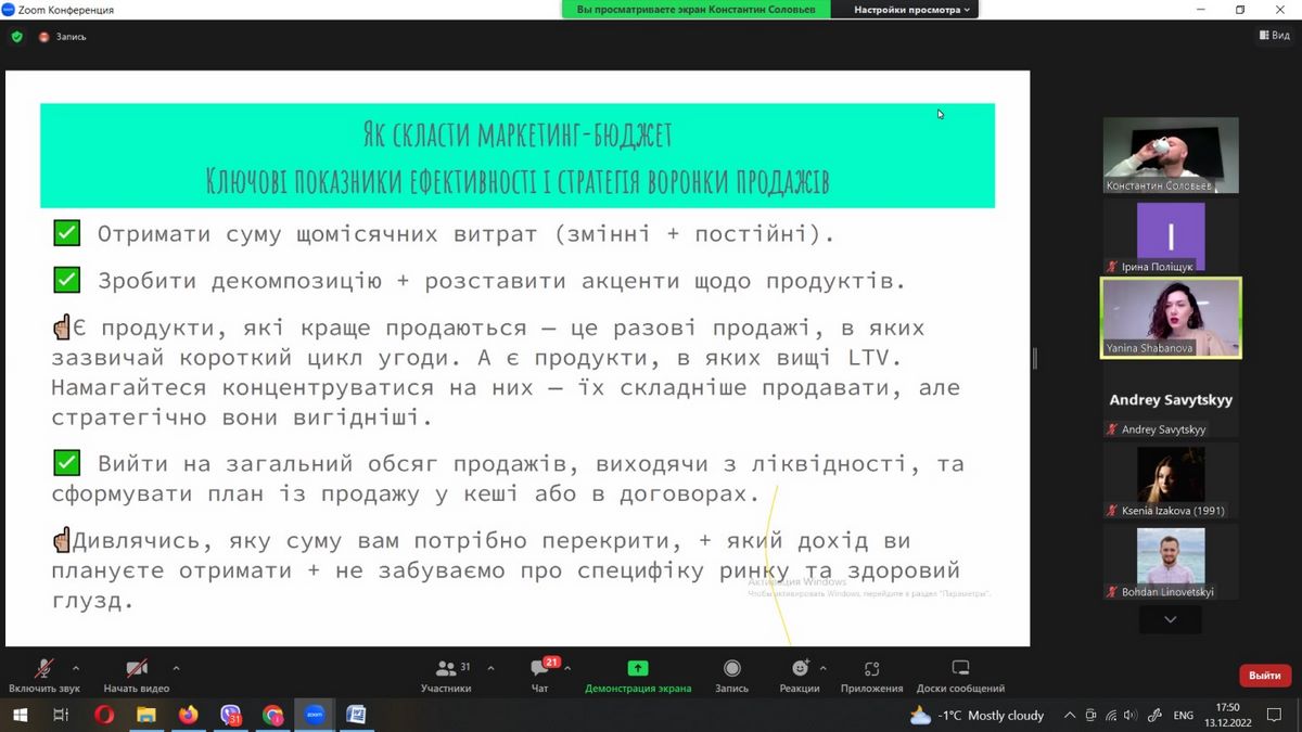 13 грудня 2022 року здобувачі вищої освіти спеціальності 075 «Маркетинг» разом із науково-педагогічними працівниками кафедри маркетингу та реклами взяли участь в онлайн-лекції «Вихід стартапу на ринок» в рамках програми Mentor Yard, що проводив Констянтин Соловйов – консультант з growth-маркетингу, засновник Soloviov Marketing Agency.