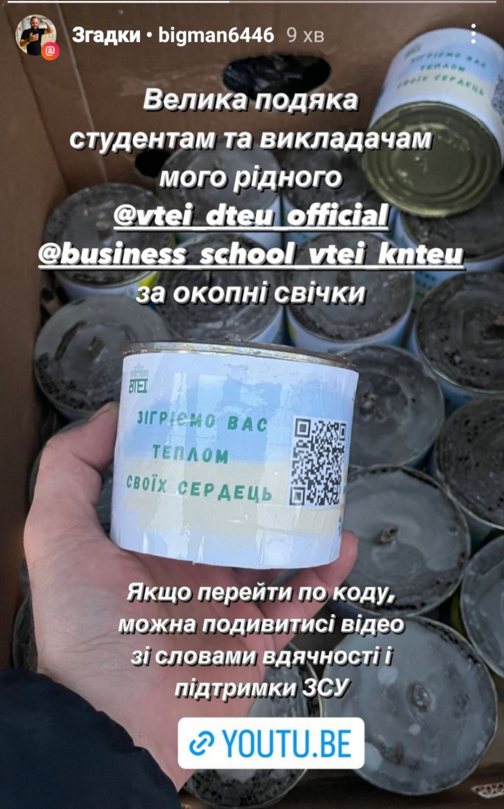 В рамках даного проєкту здійснюється виготовлення окопних свічок, на етикетках яких розміщено Qr-код, перейшовши за ним можна подивитися відео зі словами вдячності та підтримки студентів Вінницького торговельно-економічного інституту ДТЕУ Збройним силам України.