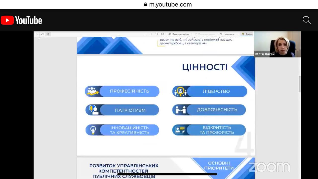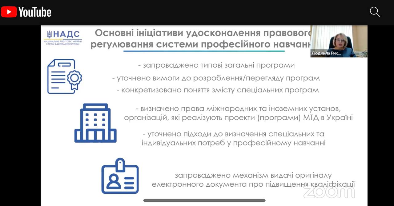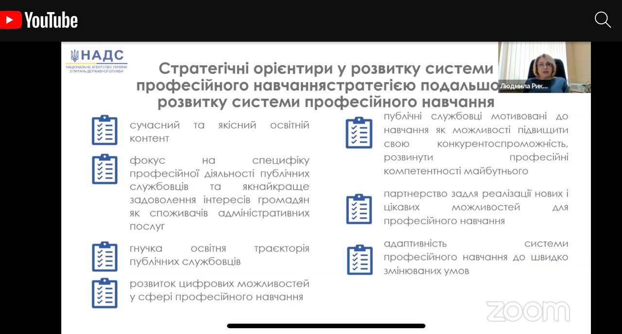 ⁃ Людмила Рикова, директор Генерального департаменту з питань професійного розвитку державних службовців та посадових осіб місцевого самоврядування НАДС, повідомила особливості правового регулювання системи професійного навчання публічних службовців;