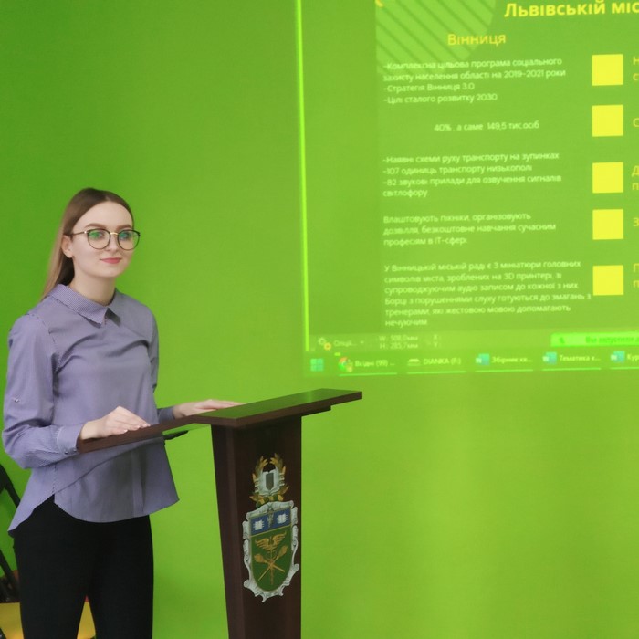 1. «Оптимізація діяльності публічних органів влади щодо впровадження політики безбар’єрності» – доповідачка Діана Харчук (гр. ПУА-31д);