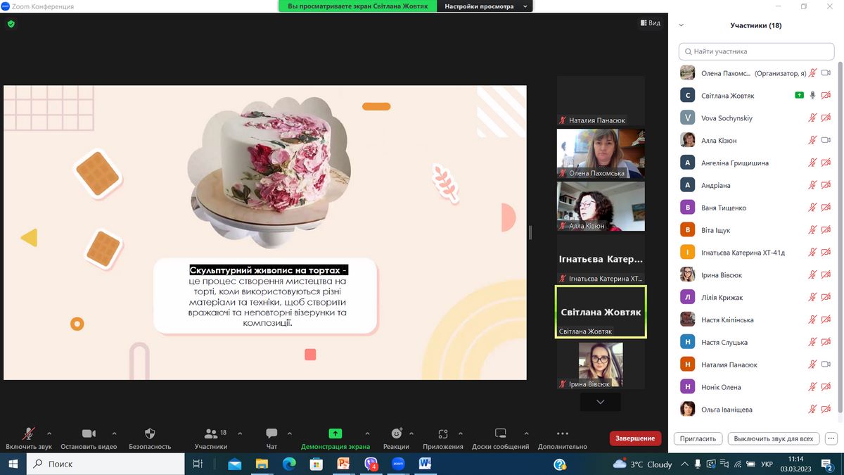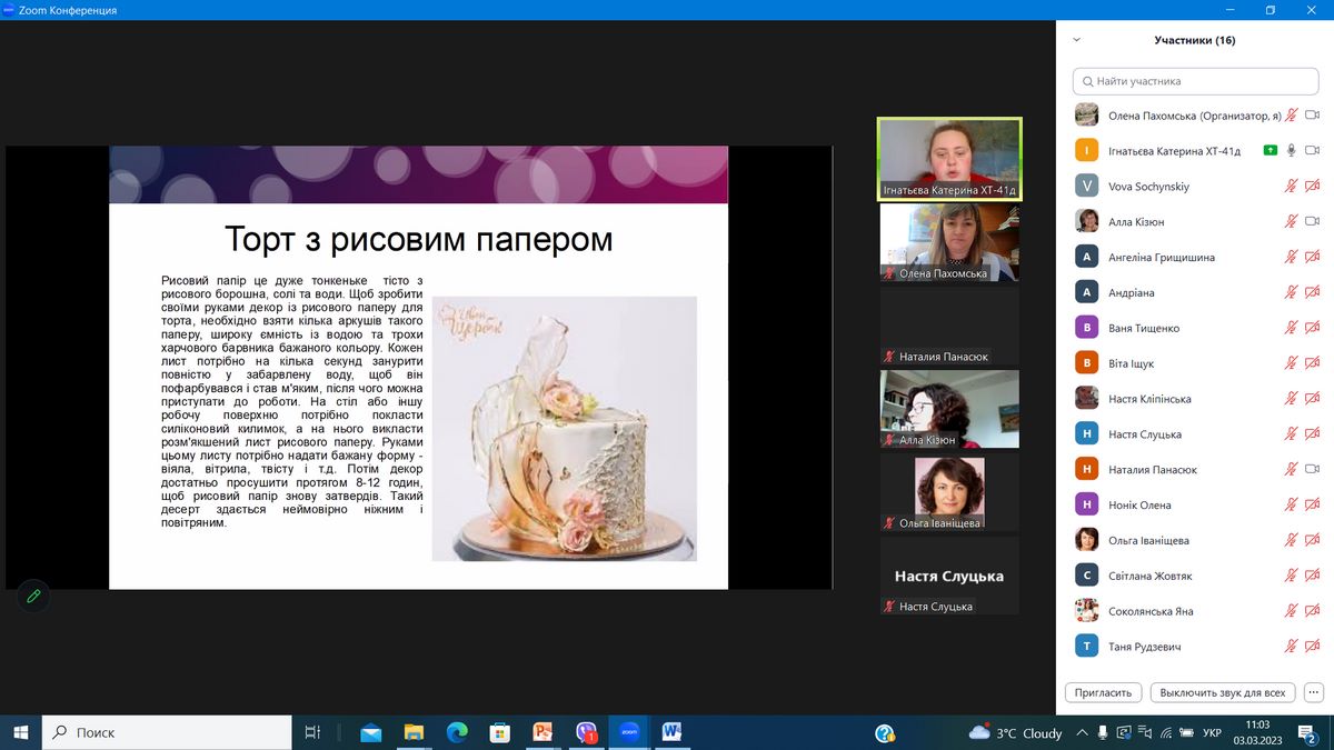 - Маримора Адріана (гр. ХТ-31д) – доповідь на тему «Килимові та кошлаті торти»;