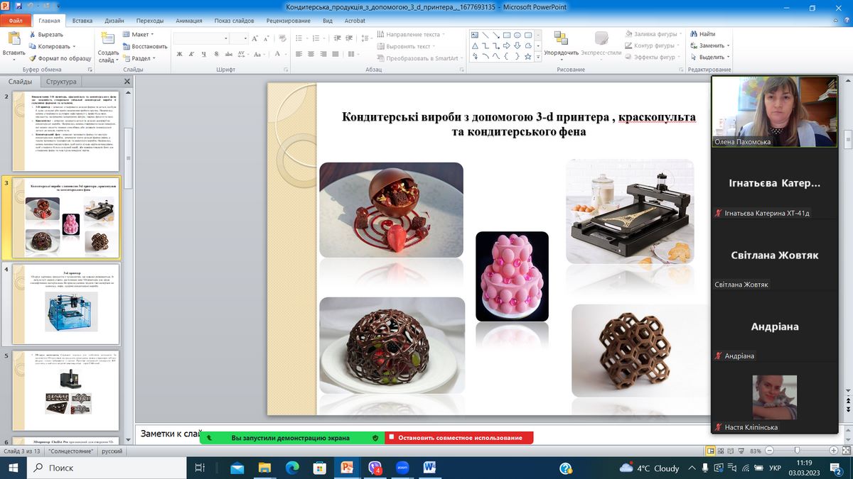 - Панасюк Наталія (гр. ХТ-31д) – доповідь на тему «Кондитерська продукція з допомогою 3-d принтера, харчового принтера, краскопульта, аерографа та кондитерського фена».