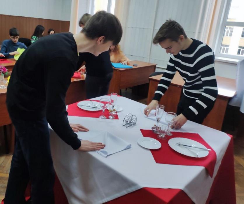 3 березня 2023 року для учнів 10-А та 10-Б класу КЗ «Вінницький гуманітарний ліцей №1 імені М.І. Пирогова» асистент кафедри туризму та готельно-ресторанної справи Олена Пахомська провела майстер-клас «Святкове тематичне сервірування столу та техніки складання столових серветок». Мета заходу - розвиток естетичного смаку, моторики рук, рухової та емоційної пам'яті, формування знань про столовий посуд, приладдя, столову білизну, вміння підбирати їх у процесі сервірування тематичного святкового столу.