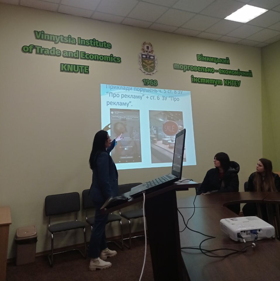 Особливістю даного засідання стало те, що крім здобувачів вищої освіти ВТЕІ ДТЕУ у засіданні брали участь представники бізнесу міста Вінниці, які активно долучилися до обговорення різних практичних ситуацій, що містили випадки порушення законодавства «Про рекламу», «Про забезпечення функціонування української мови як державної».