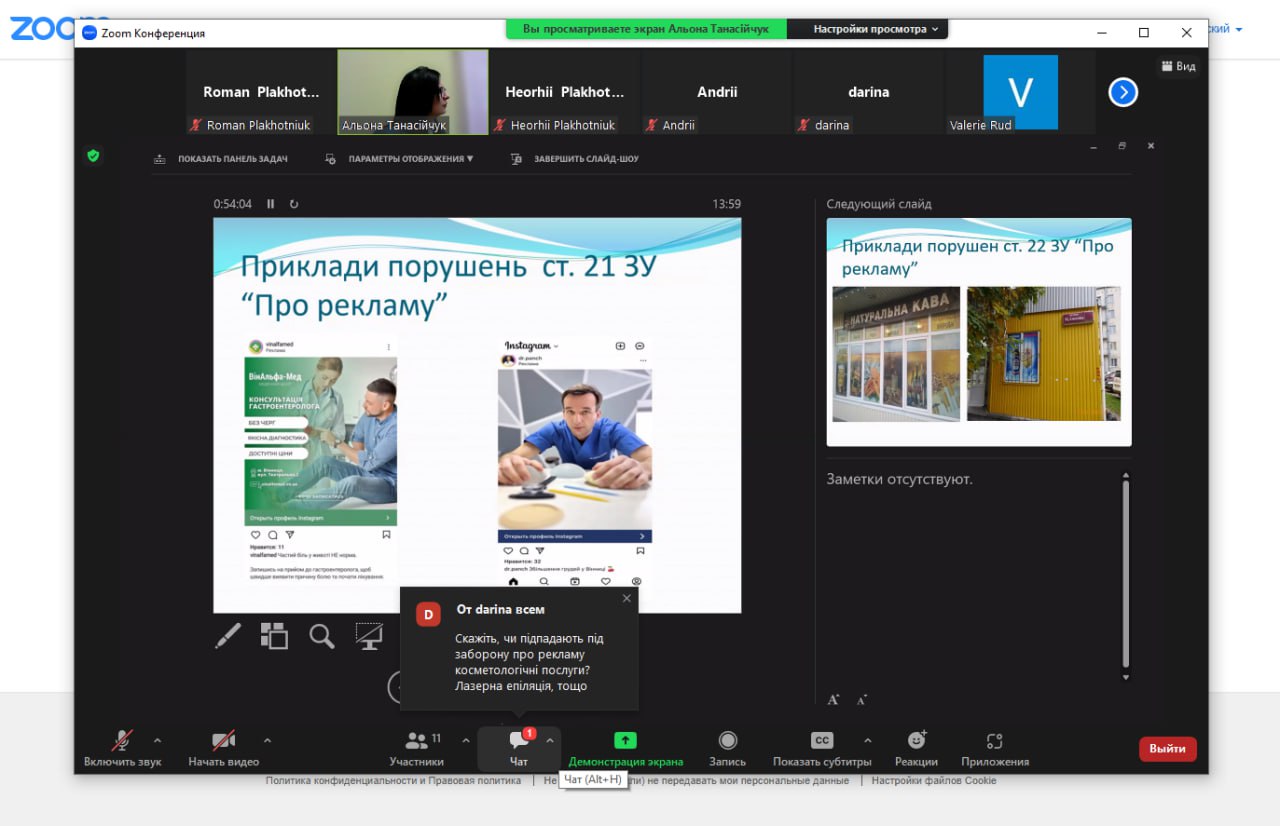 Молодь із зацікавленістю знайомилася з прикладами практичних кейсів, які продемонструвала спікер. В процесі розгляду прикладів всі учасники мали можливість висловлювати власну експертну думку щодо наявних в них порушень законодавства.
