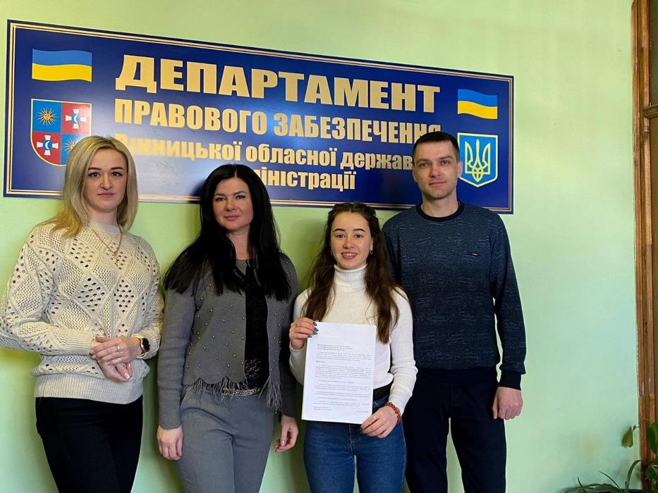 Студентка спеціальності «Право» Наталія Розгон пройшла стажування в Департаменті правового забезпечення Вінницької обласної військової адміністрації