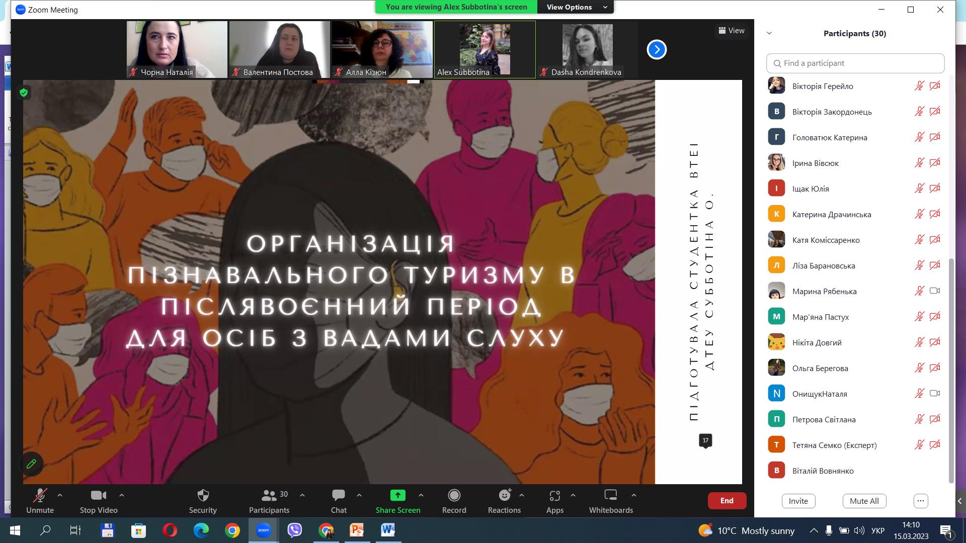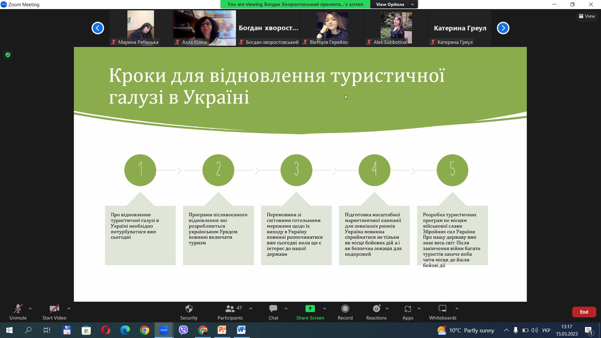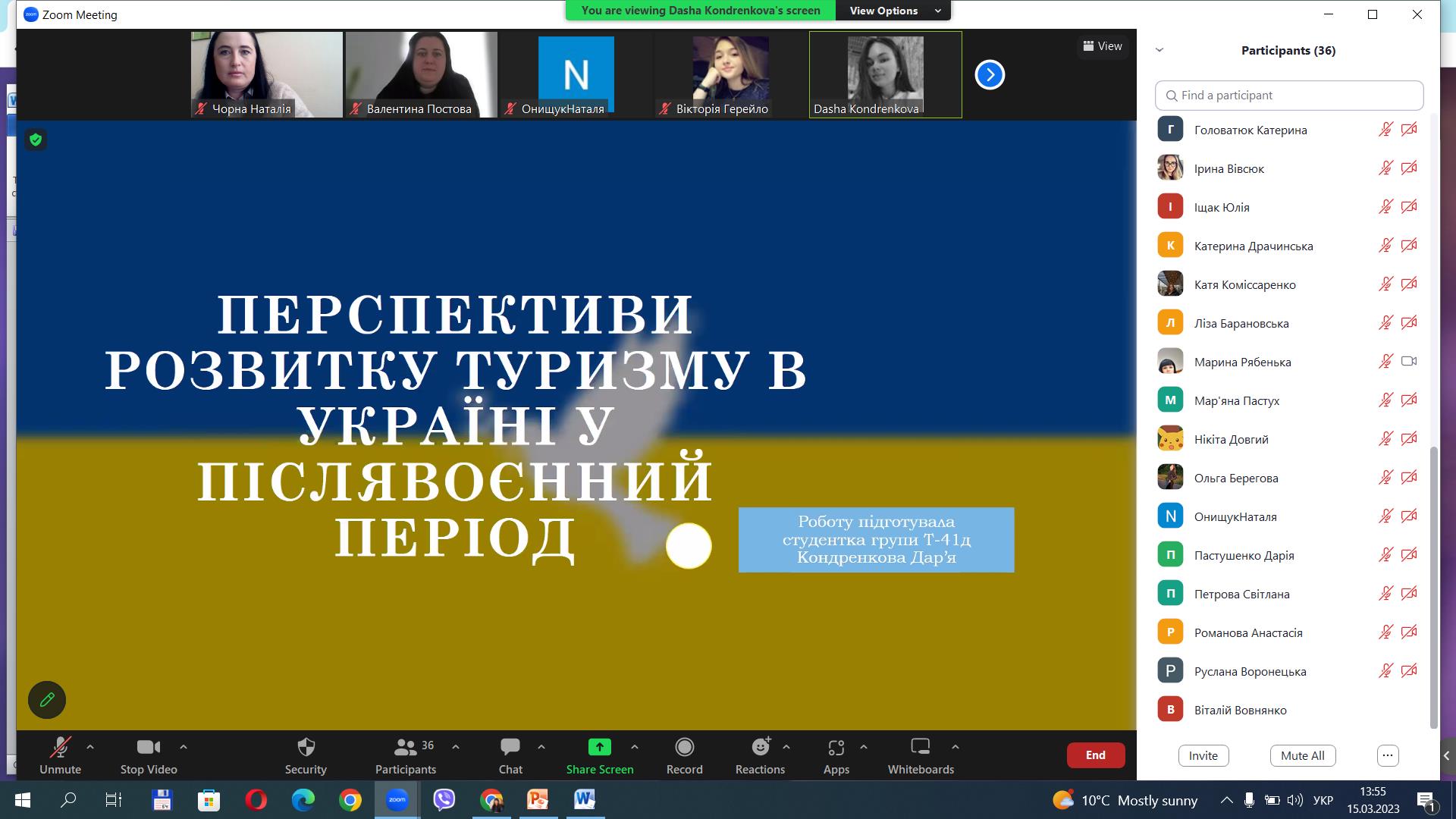 5. Дар’я Кондренкова, гр. Т-41д – доповідь на тему «Перспективи розвитку туризму в Україні у післявоєнний період».