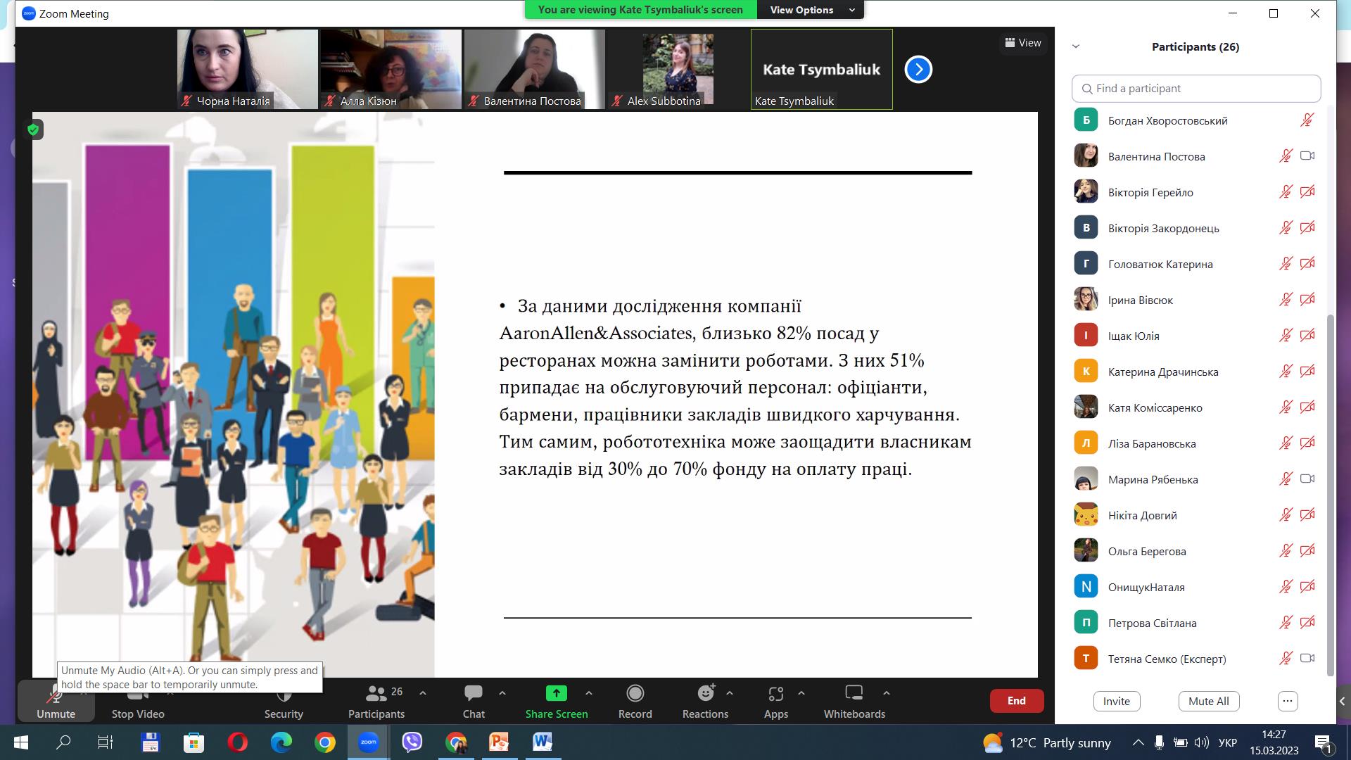7. Катерина Цимбалюк, гр. ГРС-42д – доповідь на тему «Перспективи впровадження інтелектуальної автоматизації та робототехніки в ресторанний бізнес в умовах післявоєнного відновлення України».