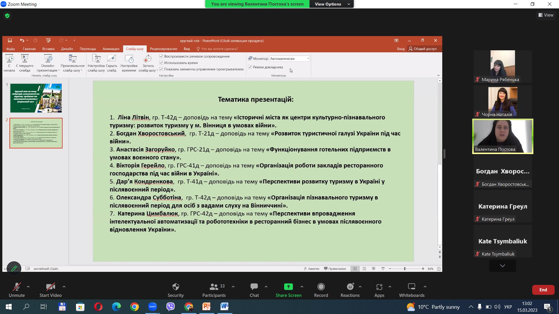 2. Богдан Хворостовський, гр. Т-21д – доповідь на тему «Розвиток туристичної галузі України під час війни».