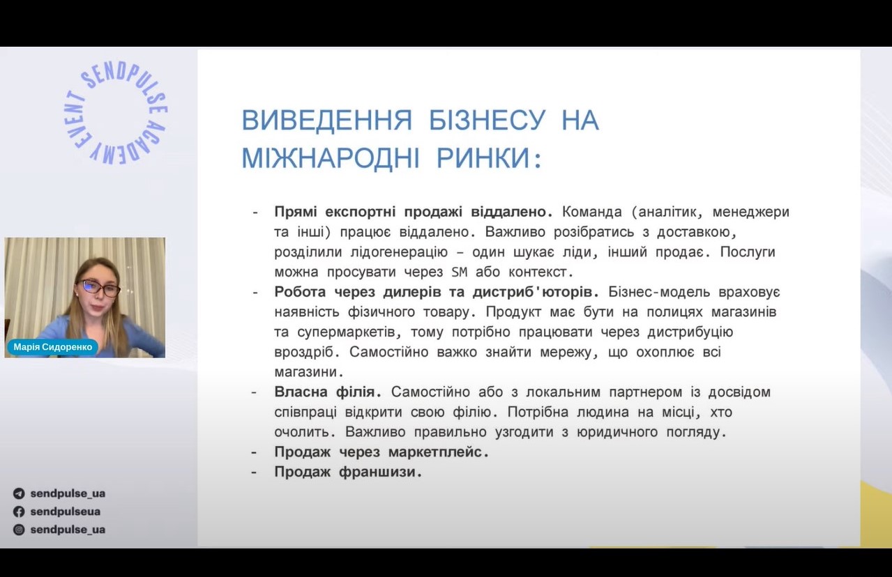 Експерт розповіла про пріоритети власника бізнесу сьогодні; воронку для залучення клієнтів; моделі виведення бізнесу на міжнародні ринки та особливості побудови віддаленої команди.