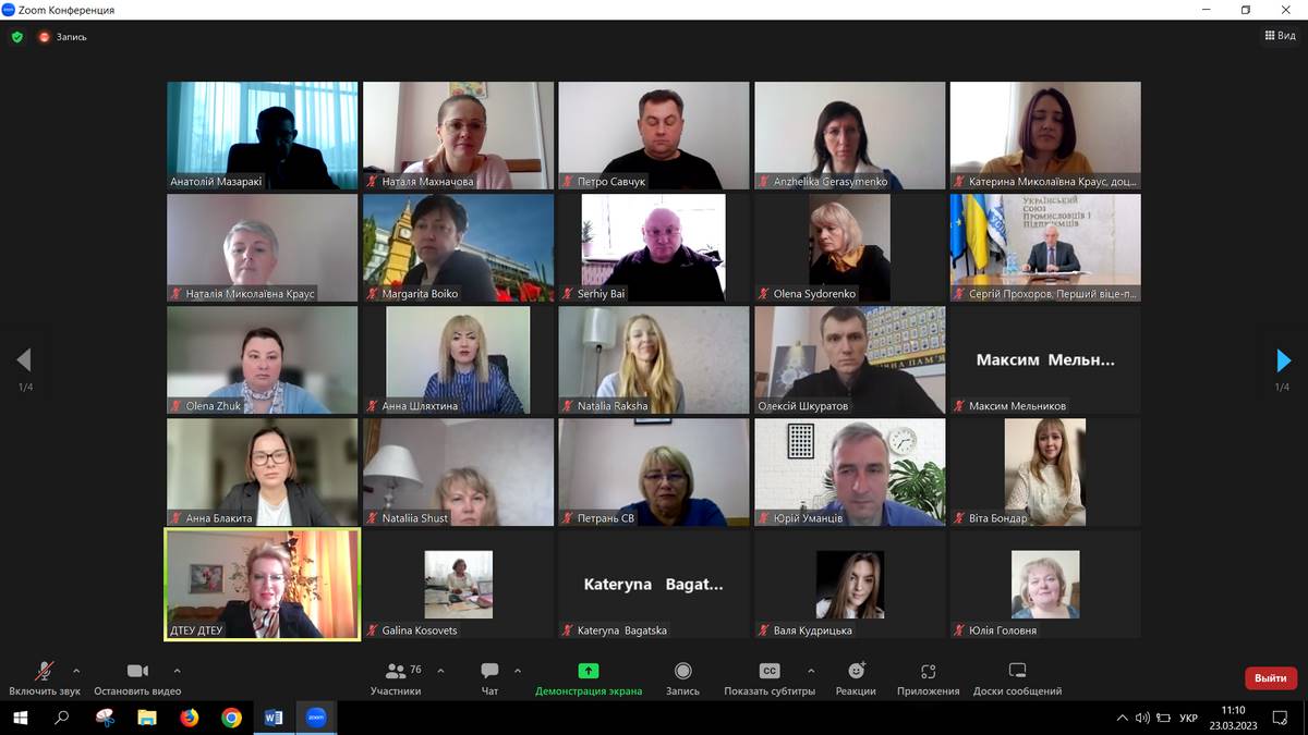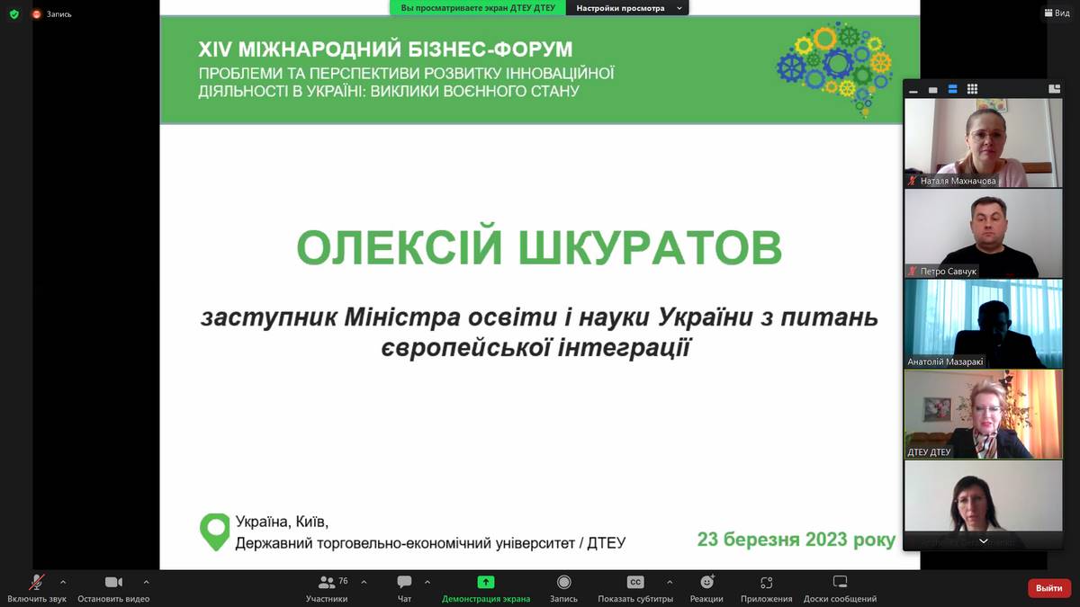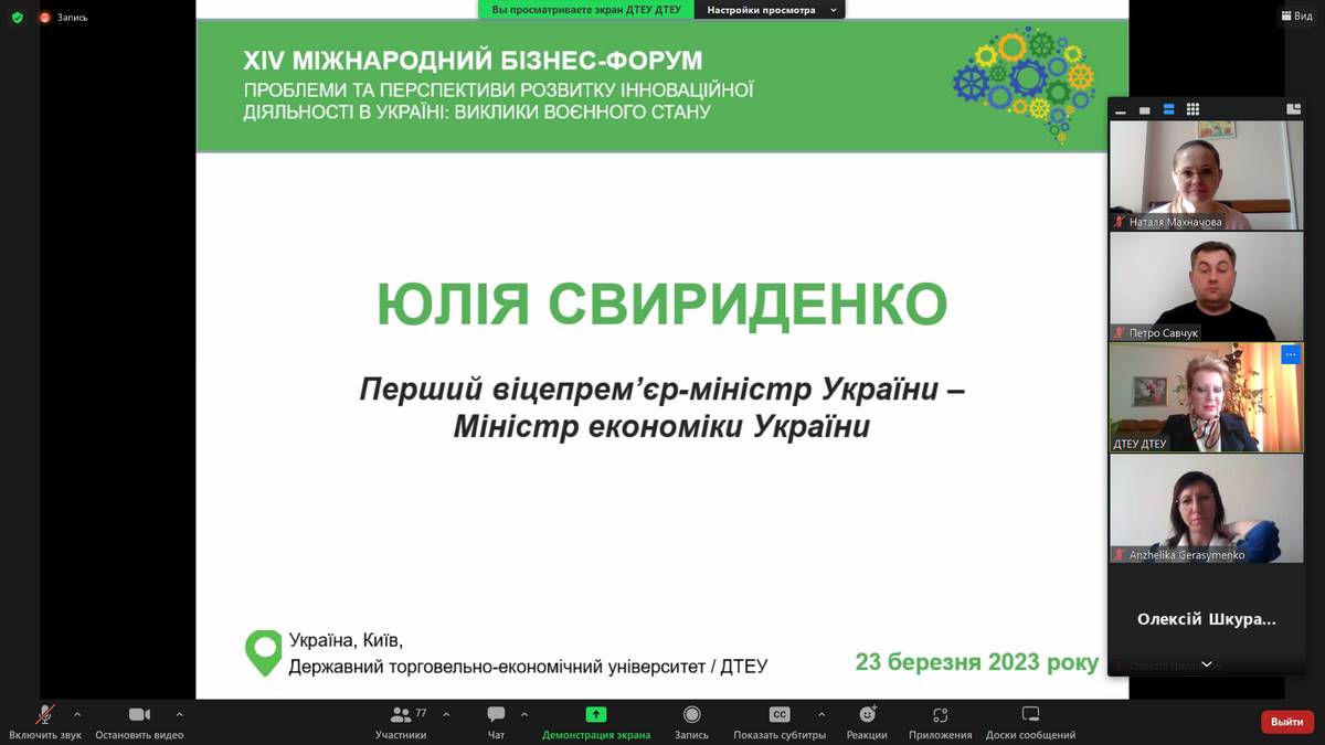 23 березня 2023 року у Державному торговельно-економічному університеті відбувся XIV Міжнародний бізнес-форум «Проблеми та перспективи розвитку інноваційної діяльності в Україні: виклики воєнного стану» у формі zoom-відеоконференції. Метою бізнес-форуму було обговорення актуальних проблем та напрацювання напрямків розвитку інноваційних процесів в Україні в умовах викликів воєнного стану. Участь у форумі взяли представники центральних органів виконавчої влади, бізнесу, наукових та освітніх організацій. До роботи форуму долучилися науково-педагогічні працівники кафедри менеджменту та адміністрування і кафедри економіки та міжнародних відносин.