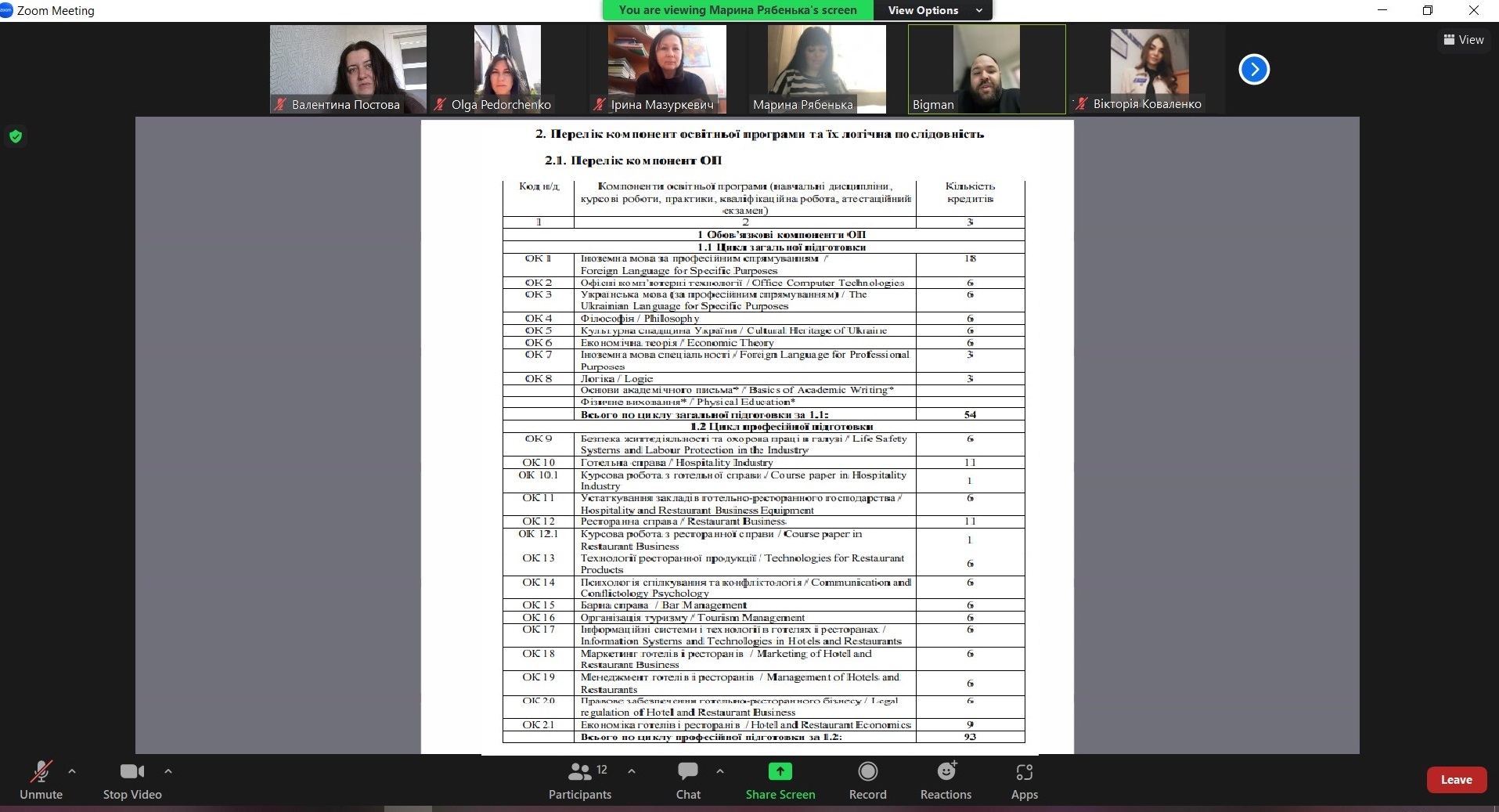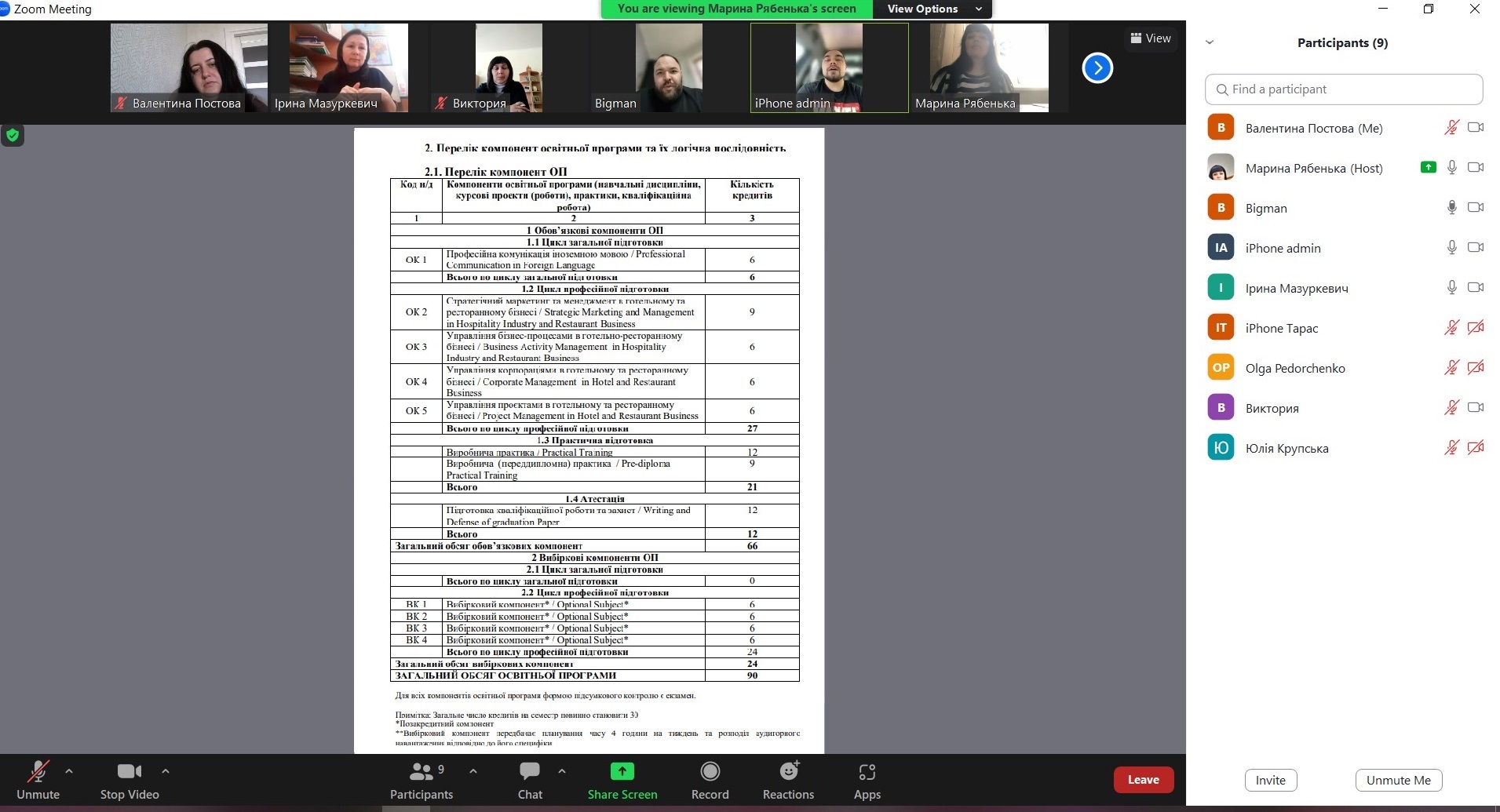 Засідання робочої групи з розроблення освітньо-професійних програм «Готельно-ресторанна справа» ОС «Бакалавр» та «Магістр»