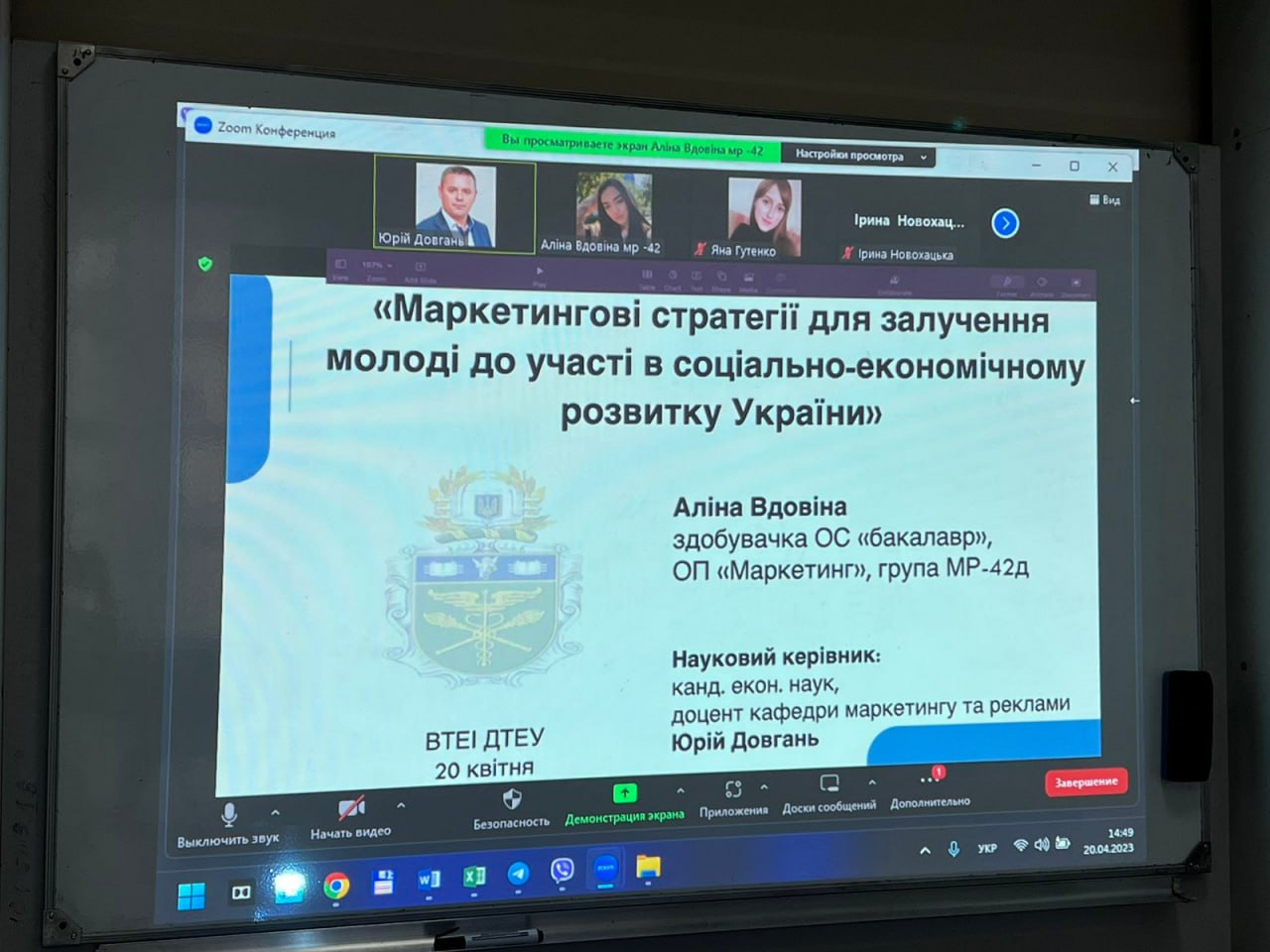 20 квітня 2023 року здобувачі вищої освіти освітніх програм «Маркетинг» та «Логістика» прийняли участь у засіданні секції «Маркетингові технології в умовах інноваційного розвитку бізнесу», яке проведено в рамках ХІІ Всеукраїнської студентської науково-практичної конференції «Актуальні проблеми ефективного соціально-економічного розвитку України: пошук молодих». Засідання відбулося у змішаному форматі: наживо та онлайн. Участь у засіданні взяли понад 20 здобувачів вищої освіти, науково-педагогічні працівники кафедри маркетингу та реклами, а також запрошені учні ліцеїв №34 та №35 м. Вінниці.