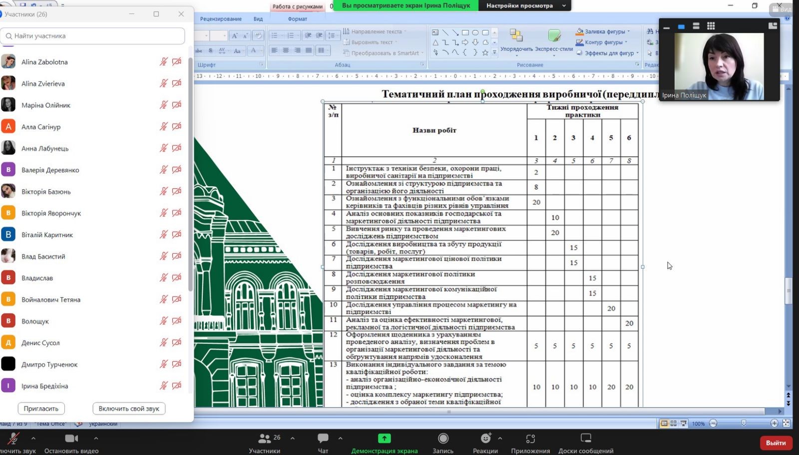 З вітальним словом виступила Поліщук Ірина, д-р екон. наук, професор, завідувач кафедри маркетингу та реклами, гарант ОПП «Маркетинг» другого (магістерського) рівня вищої освіти. Зокрема, розповіла про завершальний етап підготовки фахівців у вигляді проходження виробничої (переддипломної) практики. Було окреслено мету, визначено можливі бази практики та тематичний план проходження виробничої (переддипломної) практики.
