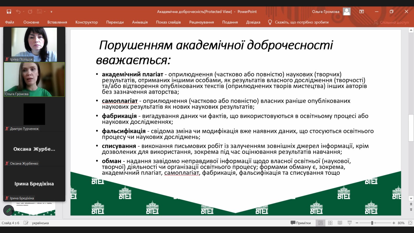 Громова Ольга, д-р екон. наук, доцент кафедри маркетингу та реклами особливу увагу звернула на розкриття змісту поняття «академічна доброчесність», її принципів, розглянула нормативно-правове забезпечення, окреслила основні правила, види порушень та можливу відповідальність за недотримання академічної доброчесності.