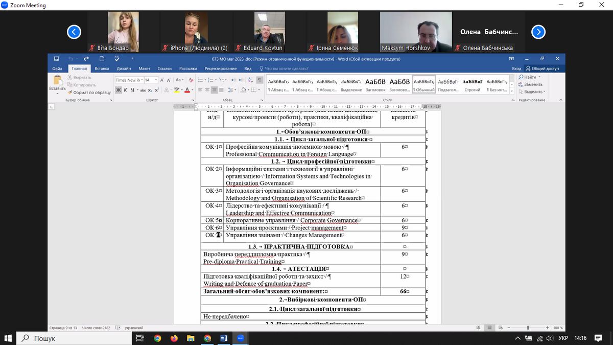 На даному засіданні гаранти освітніх програм проф. Наталія Корж, доц. Галина Іванченко, доц. Ірина Семенюк та доц. Людмила Бондарчук представили проєкти ОП. На засіданні було ґрунтовно обговорено структурно-логічні схеми навчального процесу по зазначених освітніх програмах, внесено нові освітні компоненти, доопрацьовано матриці відповідності в ОП.