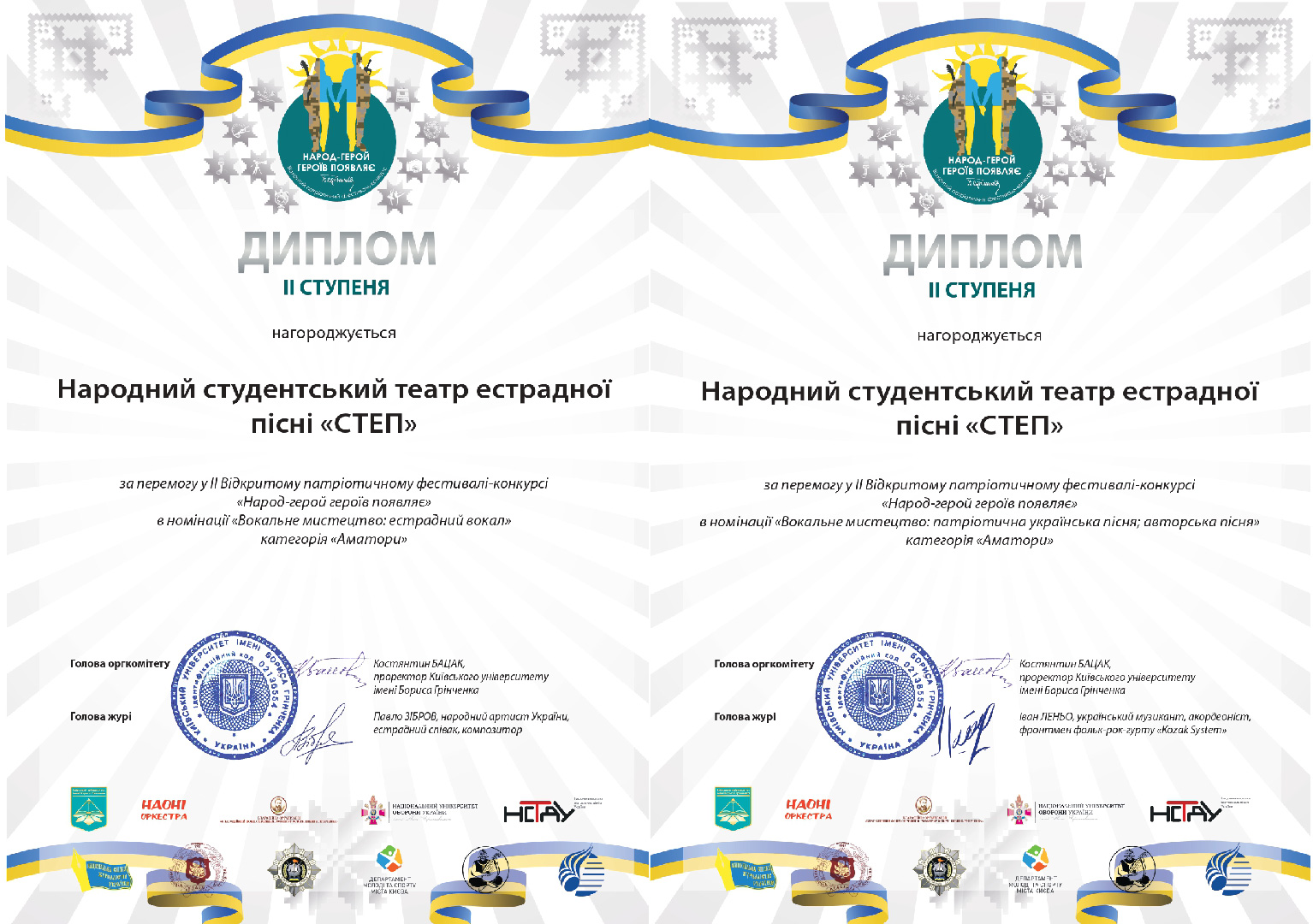 - Студентський театр естрадної пісні «СТЕП» (художній керівник Вікторія Гнатюк) - Диплом II ступеня в номінації «Вокальне мистецтво: естрадний вокал», категорія «Аматори» та Диплом II ступеня в номінації «Вокальне мистецтво: патріотична українська пісня; авторська пісня», категорія «Аматори»;