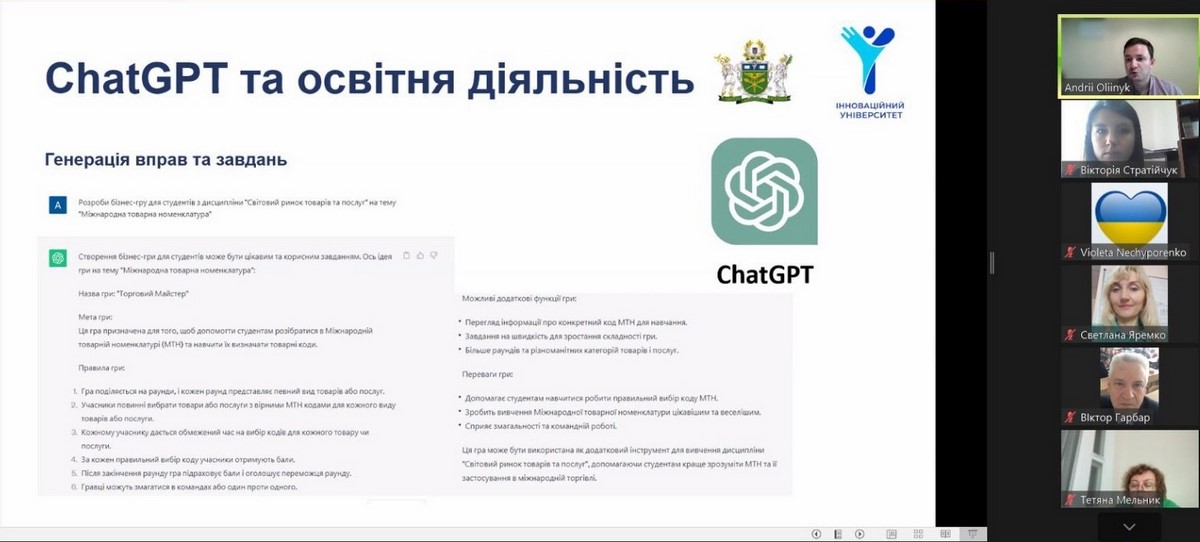 13 вересня 2023 року відбувся науковий вебінар на базі ДТЕУ на тему «ChatGPT та інші інструменти ШІ: інновації для розширення можливостей викладача у навчальній та науковій діяльності» у якому взяли участь наукові педагогічні працівники ВТЕІ ДТЕУ.