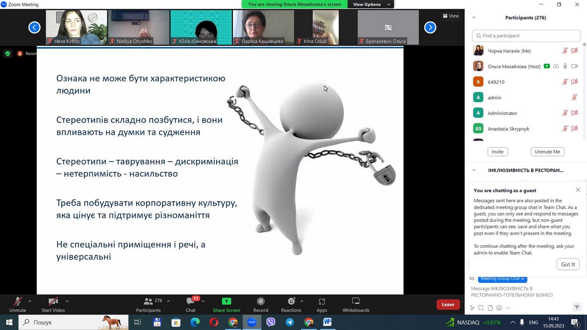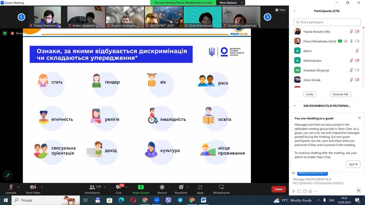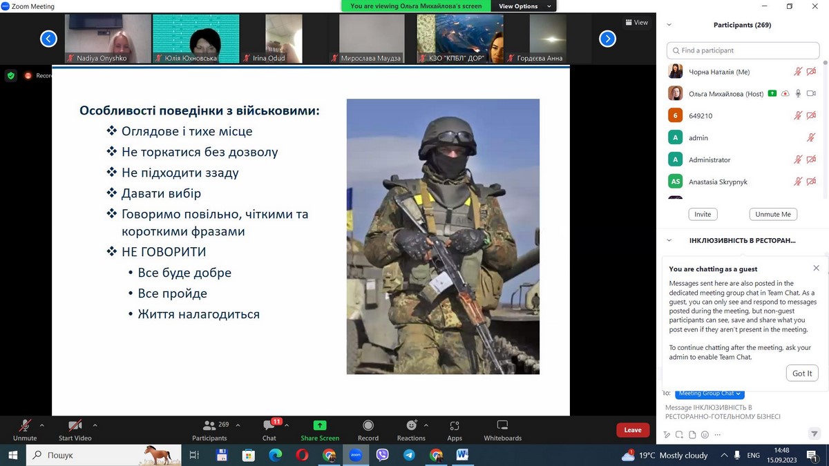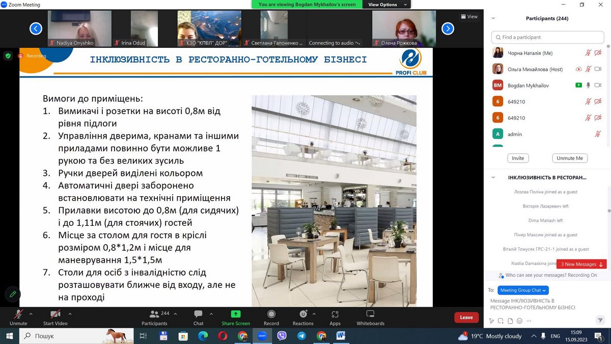 15 вересня 2023 року науково-педагогічні працівники кафедри туризму та готельно-ресторанної справи, здобувачі вищої освіти за спеціальністю 241 «Готельно-ресторанна справа» пройшли онлайн навчання на тему «Інклюзивність у готельно-ресторанному бізнесі». Спікерами заходу виступили Ольга Михайлова, керівник тренінгового центру «PROFI CLUB» і співзасновник ГО «Ресторанна Гільдія», Олена Булах, голова ГО «Ассоціація рестораторів та готельєрів», Оксана Бутурліна, директор центру компетенцій Федерації організацій роботодавців.