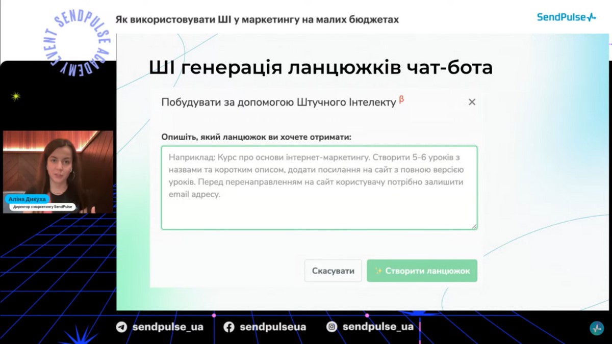 Спікерка вебінару - Аліна Дикуха, директор з маркетингу SendPulse, яка розповіла про можливості штучного інтелекту у маркетингу для малих та середніх компаній, роботу із командою розробки на рівні додавання різних моделей ШІ у сервісі SendPulse, про ШІ модель GPT-3, ШІ генерацію ланцюжків чат-бота, автоматизацію процесів, а саме як ШІ дозволяє автоматизувати рутинні задачі у маркетингу, рекомендації для підприємців та малих бізнесів: як почати використовувати ШІ в маркетингу, навіть з обмеженими бюджетами, контент для сайтів і ШІ, роботу мобільного застосунку InstaShot та ШІ.