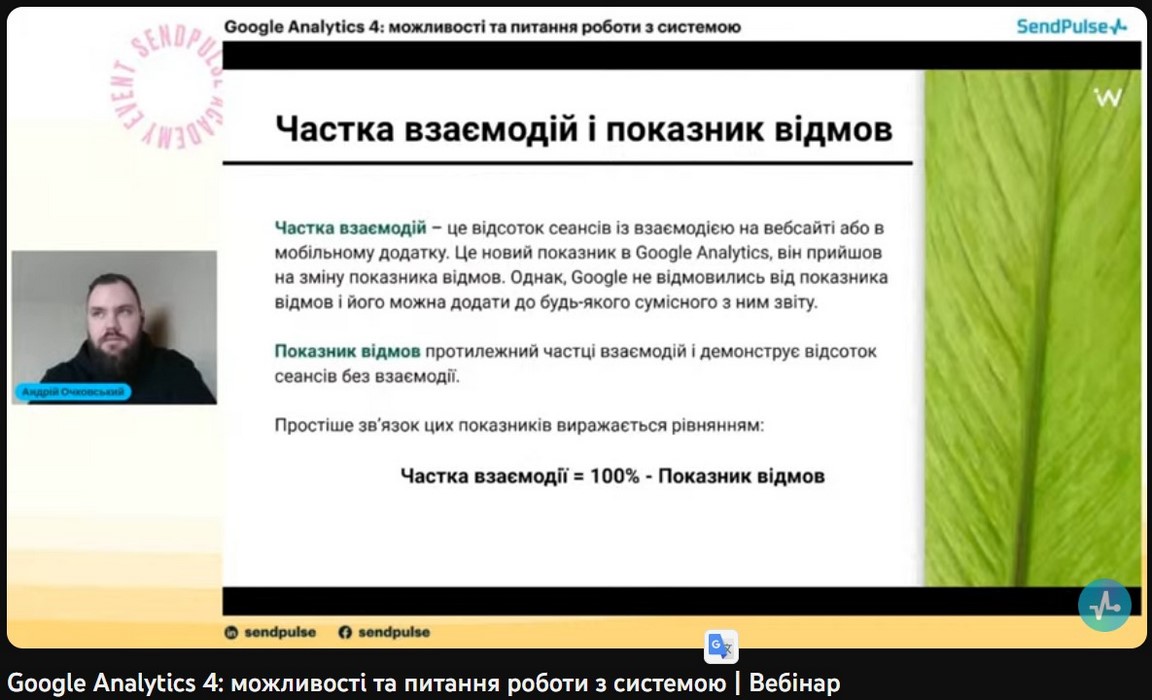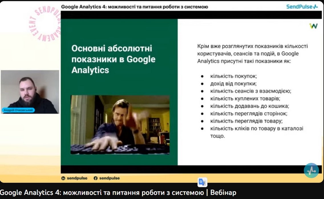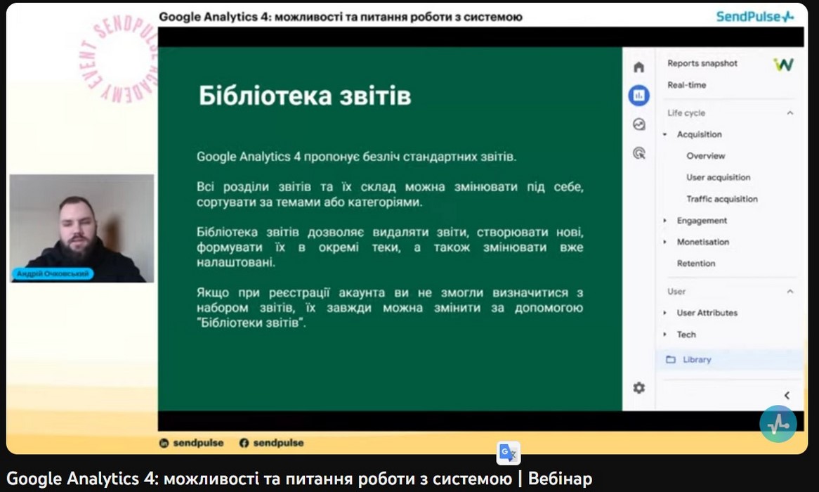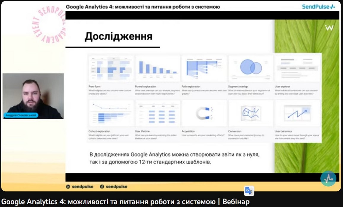Фахівці підрозділу компанії «СендПульс Україна» ознайомили учасників вебінару з можливостями ресурсу Google Analytics 4 та роз’яснили як за його допомогою: збирати дані веб-сайтів й додатків, щоб краще відстежити шлях клієнта до конверсії; використовувати дані на основі подій, а не сеансів; забезпечуватиь захист конфіденційності, наприклад відстеження без файлів cookie, і може моделювати поведінку й конверсії; використовувати функції, що спрощують прогнозування показників; інтегруватися в медіаплатформи, щоб покращувати взаємодію з веб-сайтами й додатками.