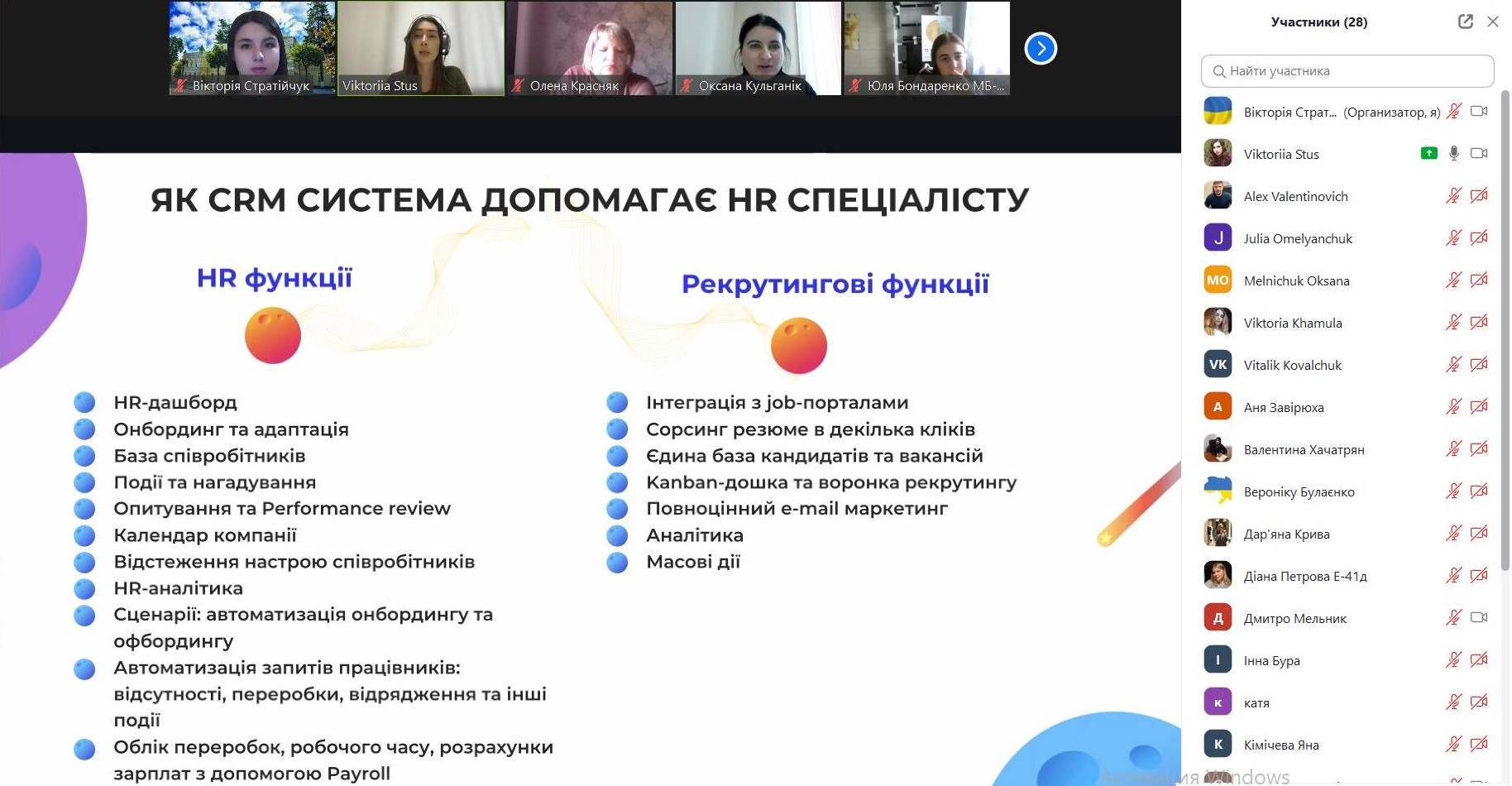Спікер поділилася досвідом роботи в сучасній компанії, що динамічно розвивається та реалізує міжнародні проєкти, презентувала інноваційні методи автоматизації бізнес-процесів та гейміфікації в управлінні компанією. В ході дискусії обговорили сучасні тренди розвитку НR-сектору, інноваційні інструменти покращення середовища роботи працівників, визначили роль CRM-системи в роботі SkySoft.tech.