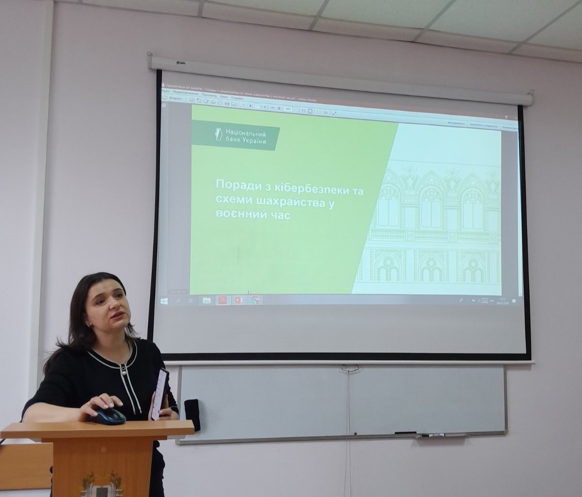 Матеріали надано експертами Національного банку України в межах Всеукраїнської інформаційної кампанії з протидії платіжному шахрайству. На занятті здобувачі вищої освіти дізналися про заходи власної кібербезпеки та нові схеми шахрайств у воєнний час. Виконували практичні завдання та тестування для визначення власної обізнаності, щодо захисту від злочинних дій шахраїв через інтернет. Будьмо уважними та відповідальними за свої дії!