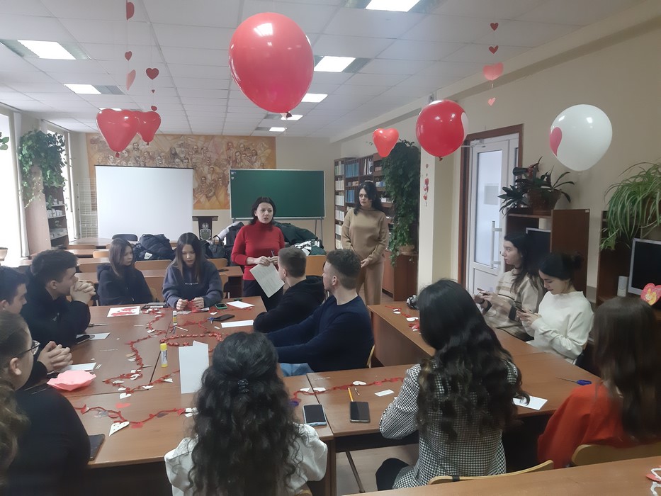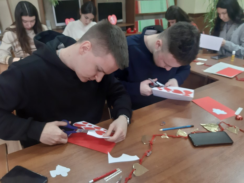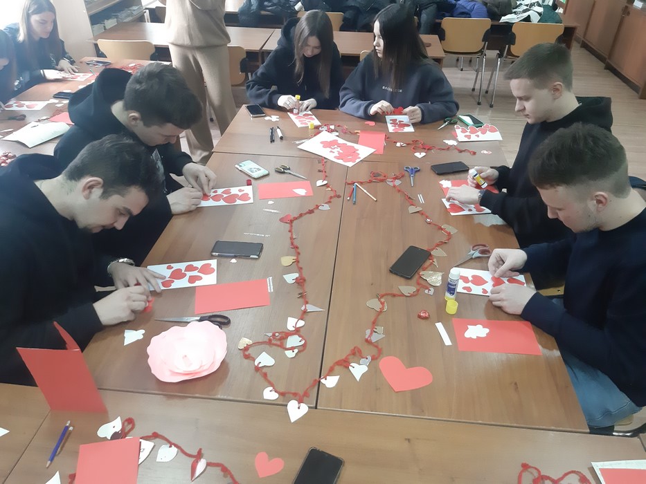 12 лютого 2024 року, напередодні Дня святого Валентина, співробітники бібліотеки ВТЕІ ДТЕУ Олена Літвінова та Юлія Лащенко провели майстер-клас з виготовлення валентинок для студентів ФТМСО груп ТР-11д, ПТ-11д. Учасники заходу творчо підійшли до створення вітальних листівок. Кожна робота набула своєї неповторності, здобувачі вищої освіти намагалися втілити власні фантазії, зробити виріб особливим. Виготовлення оригінальних валентинок дозволило проявити креативність, сприяло святковому настрою. Майстер-клас пройшов у дружній та теплій атмосфері.