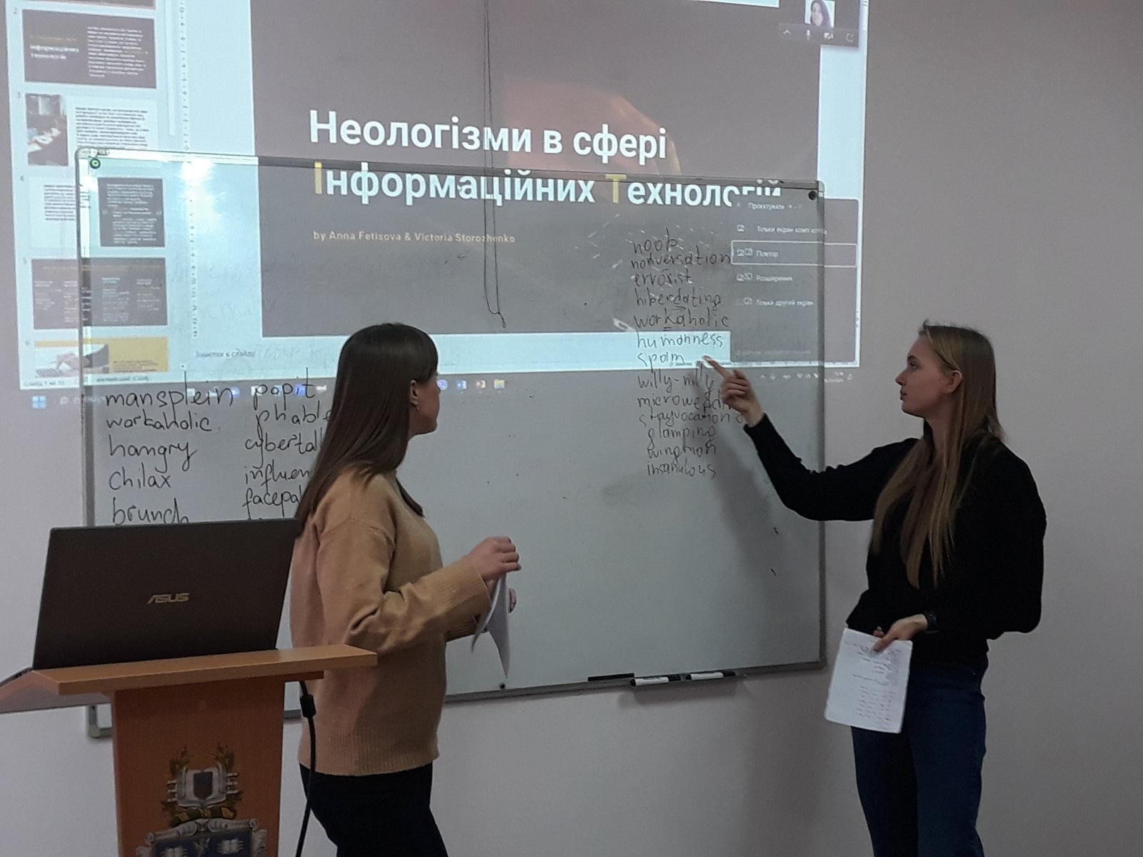 У засіданні наукового гуртка взяли участь здобувачі освітнього ступеня «бакалавр», які презентувати доповіді «Neologisms as a Linguistic Phenomenon», “English Neologisms in Modern Times», «Modern Neologisms and Their Impact on the Professional Language Developement», «Modern English Neologisms and their Trends in Word Formation”, “Modern English Neologisms in Media and Ways of Their Translation”, “Problems of Translating IT Neologisms”. Представлені доповіді викликали науковий інтерес та активну дискусію серед учасників засідання та були високо оцінені викладачами кафедри іноземної філології та перекладу.