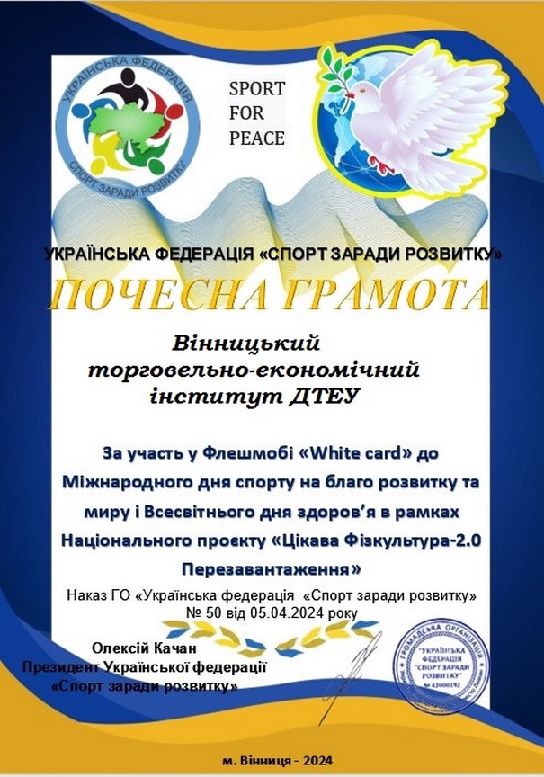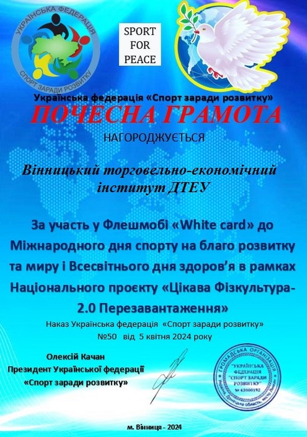 5 квітня 2024 року кафедра фізичного виховання спільно зі студентами І-ІІ курсів взяли участь у Флешмобі «White card», присвяченого Міжнародному дню спорту на благо розвитку та миру і Всесвітньому дню здоров'я в рамках Національного проєкту «Цікава фізкультура-2.0 Перезавантаження».