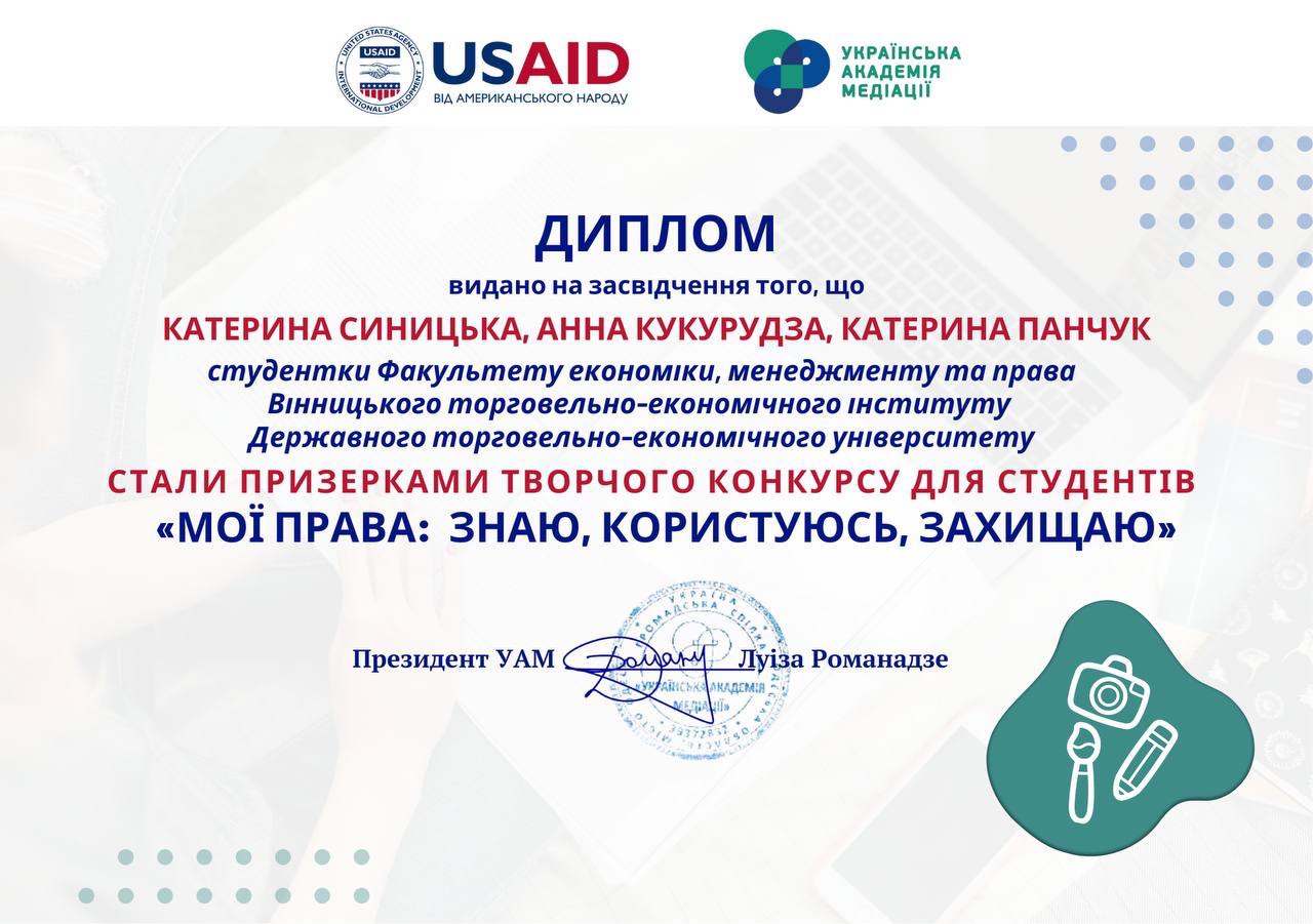 Українською академією медіації за підтримки USAID був проведений творчий конкурс «Мої права: знаю, користуюсь, захищаю», у рамках Проєкту «Формування культури консенсуального вирішення конфліктів як спосіб досягнення справедливості в українському суспільстві», в якому брали участь 50 конкурсних робіт.