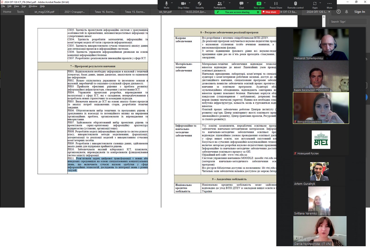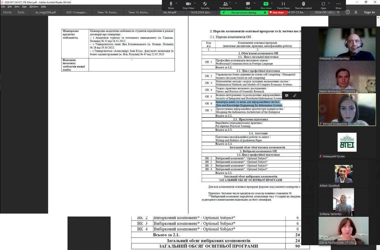 9 квітня 2024 року у змішаному форматі проведено обговорення безпосередніх аспектів підготовки фахівців освітньої програми «Інформаційні технології у бізнесі» за участі стейкголдерів, здобувачів вищої освіти, науково-педагогічних працівників кафедри економічної кібернетики та інформаційних систем.