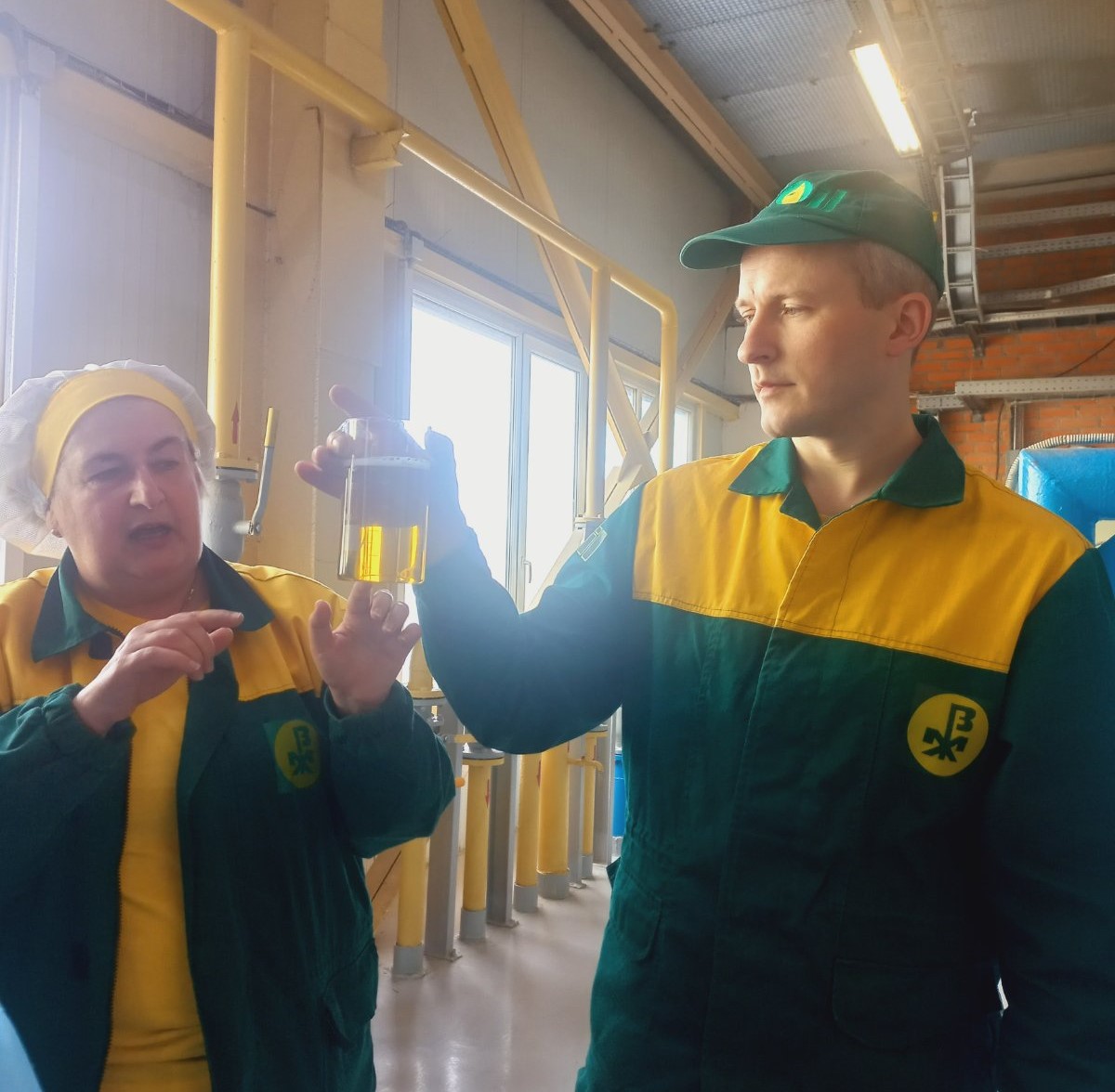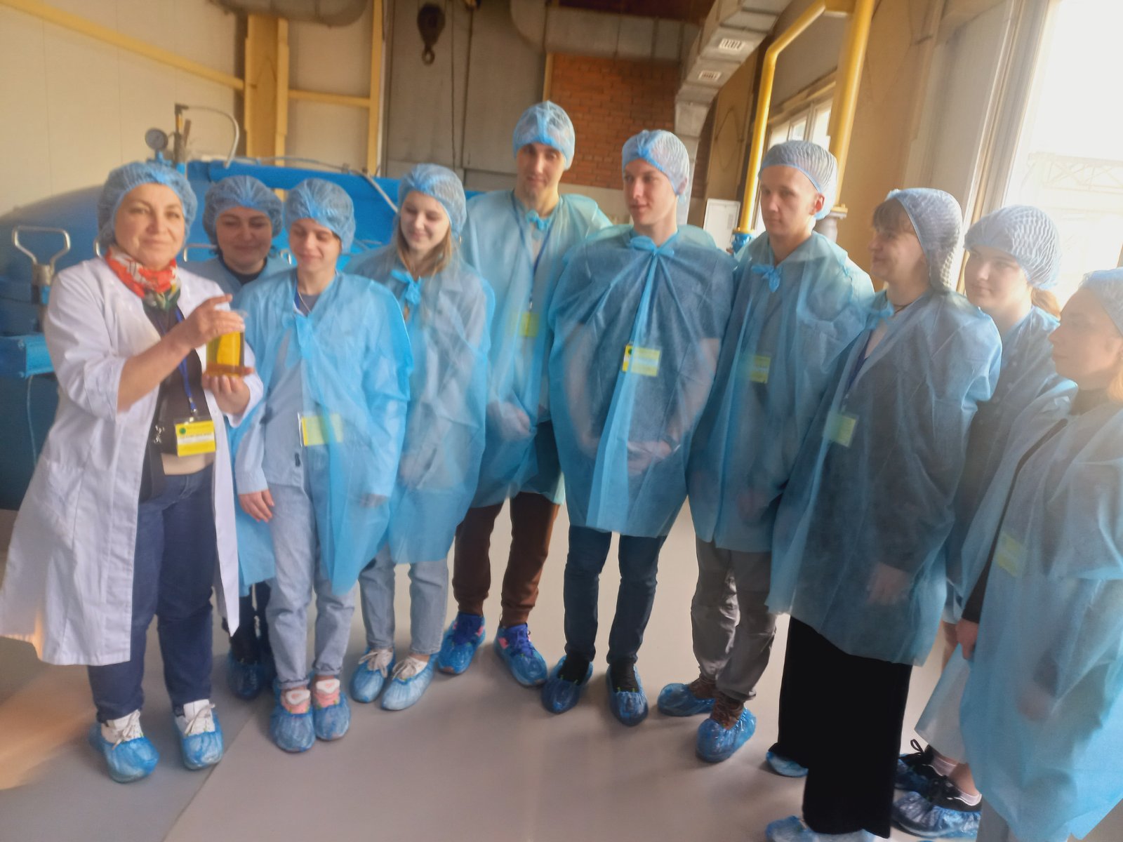 Захід, у ході якого здобувачі вищої освіти ознайомилися з виробничими потужностями підприємства, в структуру якого входять олійноекстракційний завод ОЗЖ №1 та олійноекстракційний завод ОЗЖ №2, лабораторіями підприємства, проводила заступник голови правління з виробництва Людмила Музика. Вона детально пояснила особливості кожного етапу технологічного процесу виробництва різних видів олії, провела екскурсію по цехах з демонстрацією роботи обладнання, познайомила з функціонуванням лабораторій (зразки проб продуктів, номенклатура фізико-хімічних показників, лабораторне обладнання), центром автоматизованого управління олійноекстарційним заводом та ін. Цікаво було дізнатися про енергозберігаючі технологічні новинки, які є дуже важливими в умовах воєнного стану.