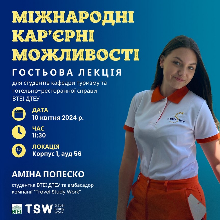 10 квітня 2024 р. для здобувачів вищої освіти за спеціальностями 242 «Туризм» / «Туризм і рекреація», 241 «Готельно-ресторанна справа»», 181 «Харчові технології» проведено гостьову лекцію на тему «Міжнародні кар’єрні можливості».
