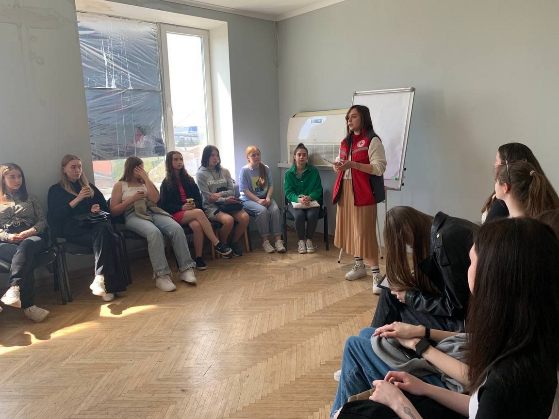 Також волонтерка напрямку Інформаційний менеджмент та Гуманістична освіта Кушнір Надія розповіла про напрями діяльності для волонтерів серед яких: надання першої допомоги, інформаційна діяльність, мобілізація ресурсів, банк одягу, пункт прокату реабілітаційної техніки, та гуманістична освіта і запропонувала бажаючим долучитися до роботи Українського Червоного Хреста.