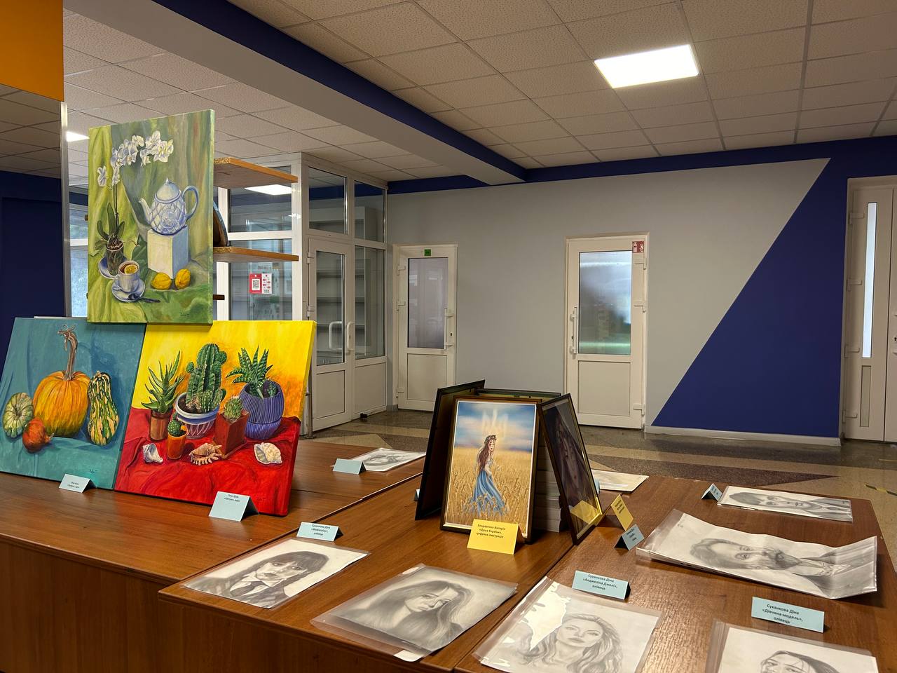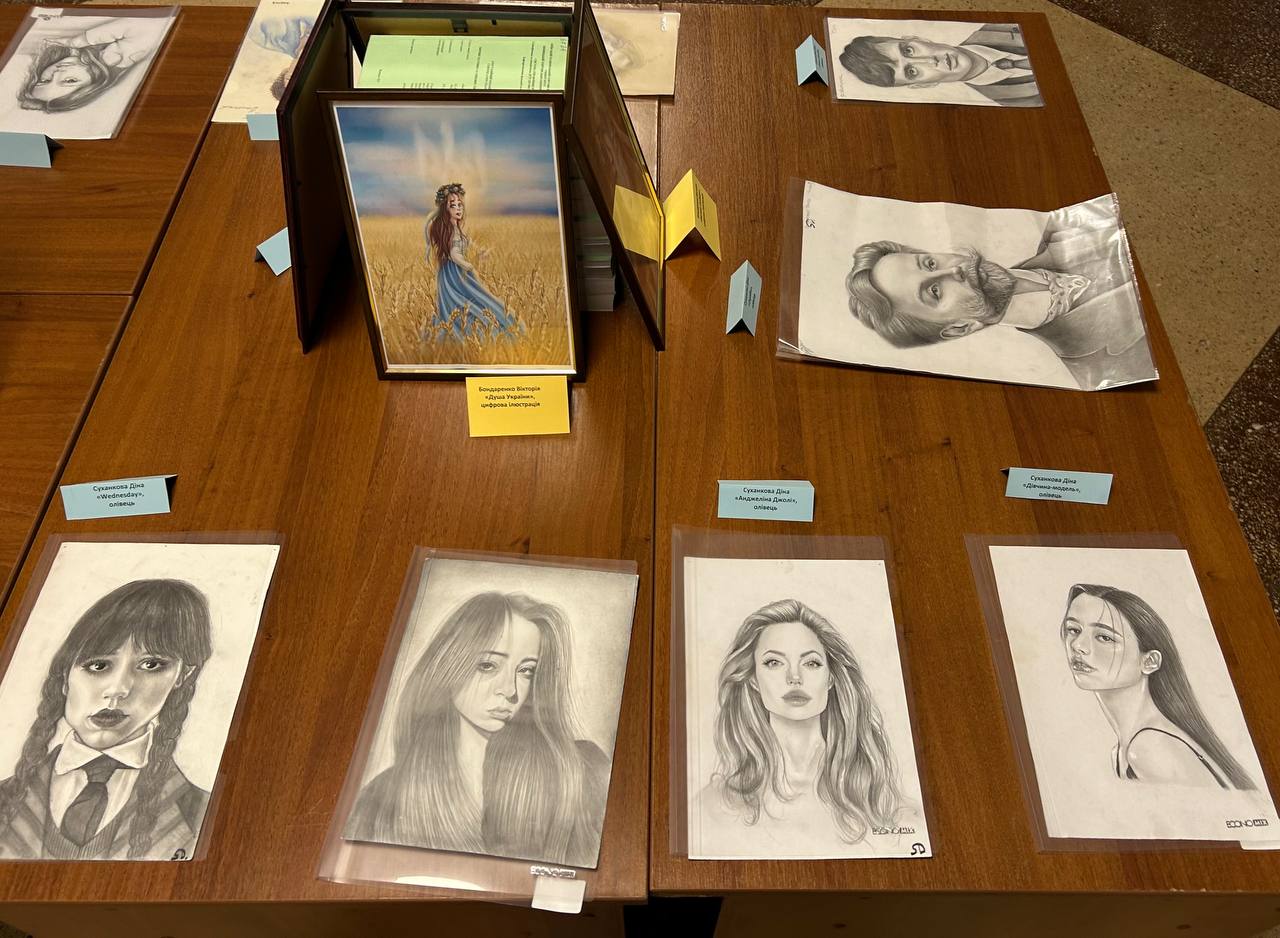Зокрема, на виставці були представлені роботи здобувачів вищої освіти: Тягун Юлії (гр. ІСТ-11д), Суханкової Діни (ІСТ-11д), Шевчук Вікторії (ІСТ-11дск), Бондаренко Вікторії (ІСТ-11д(м)). Роботи, представлені на виставці, охоплювали широкий спектр жанрів і тематик, від живопису до портретів та цифрової ілюстрації, спонукаючи глядачів до патріотизму, обміну ідеями та розвитку творчих потенціалів в інститутському середовищі.