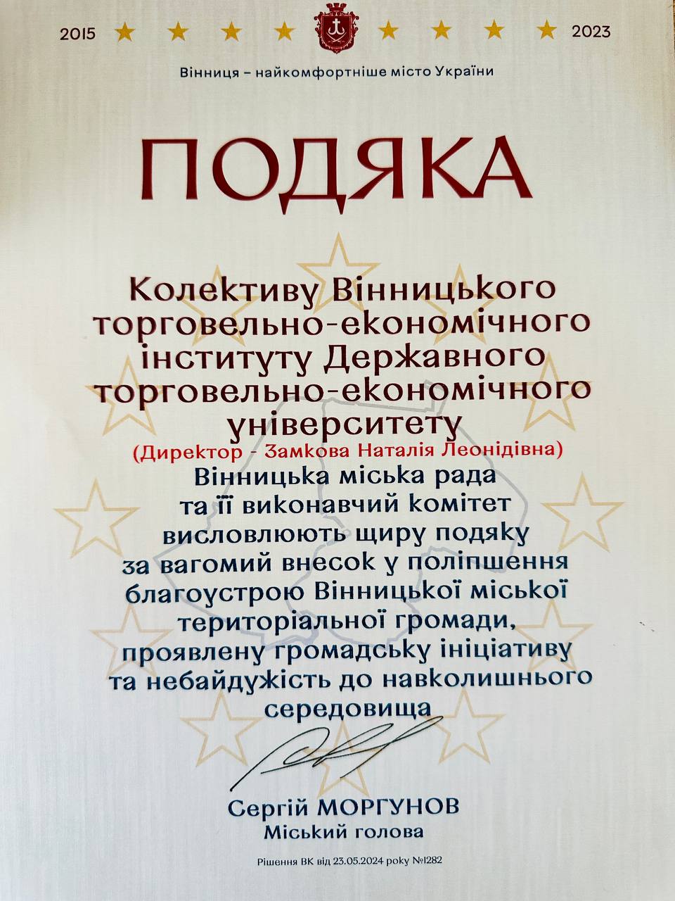 Колектив Вінницького торговельно-економічного інституту ДТЕУ, в особі директора - Замкової Наталії Леонідівни, отримав подяку від Вінницької міської ради та її виконавчого комітету. Разом до перемоги!