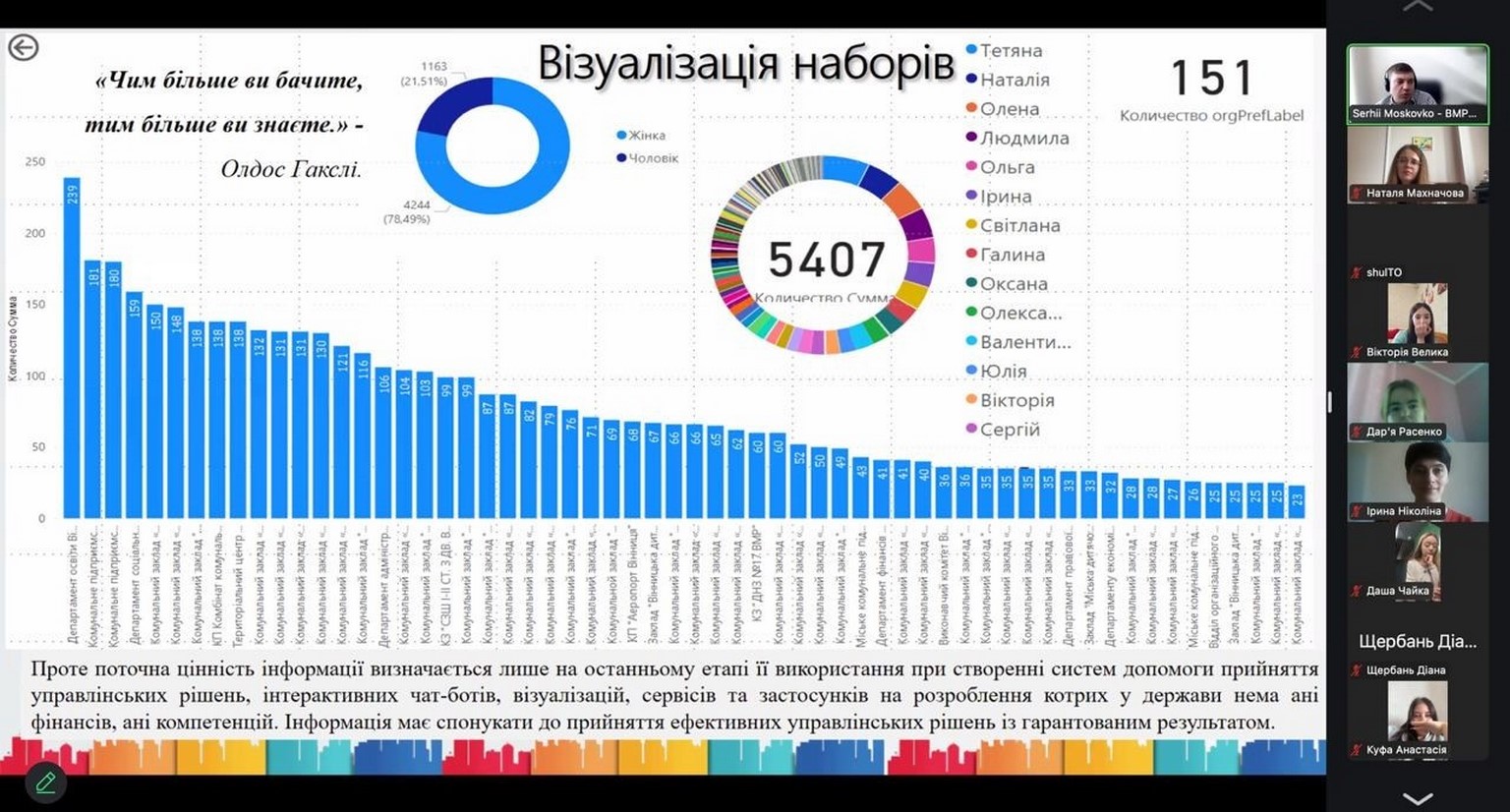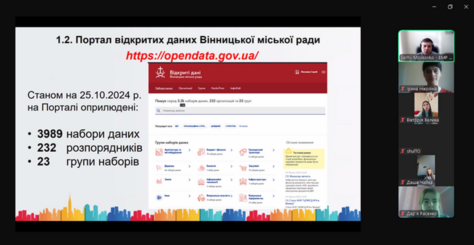 25 жовтня 2024 року для здобувачів вищої освіти ОП «Публічне управління та адміністрування» в рамках вивчення дисциплін «Цифрове урядування» (бакалаврського рівня) та «Розвиток цифрового суспільства» (магістерського рівня) проведено гостьову лекцію на тему «Відкриті данні: поняття та використання при прийнятті управлінських рішень в публічному управлінні» Сергія Миколайовича Московка, заступника начальника відділу інформатизації Департаменту інформаційних технологій Вінницької міської ради.