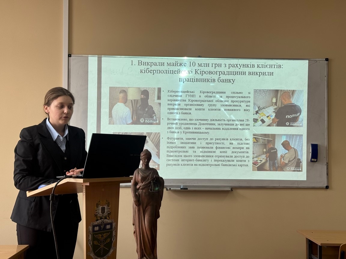 4 березня 2025 року в рамках ХІІІ Фестивалю студентської науки було проведено засідання наукового гуртка «Феміда» на тему «Кіберзлочинність: сучасні тенденції та напрями протидії», керівниця гуртка доцентка кафедри права Ірина Білоус.