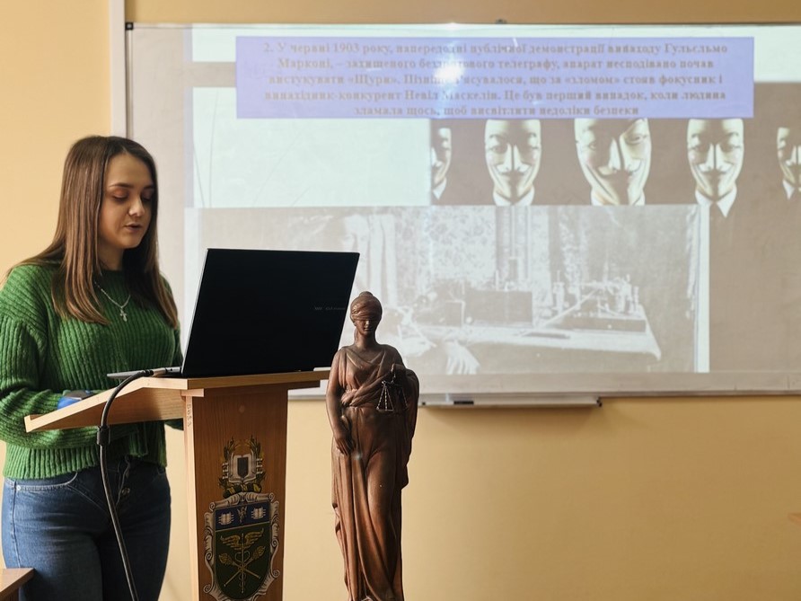 Гуртківці підготували актуальні доповіді – Ірина Богач (студентка групи ПР-32д) проаналізувала найбільш поширені кіберзлочини, які вчиняються в сучасному світі та навела статистику їх виявлення Кіберполіцією. Тетяна Витяганець (студентка групи ПР-31д) виступила з доповіддю «ТОП-10 фактів про персональні дані та кібербезпеку», в якій акцентувала увагу про підвищення правосвідомості щодо захисту персональних даних. Ростислав Карпенко (студент групи ПР-31д) надав поради як захисти себе у кіберпросторі, виступивши із доповіддю «Кіберзлочинність: як захистити себе».