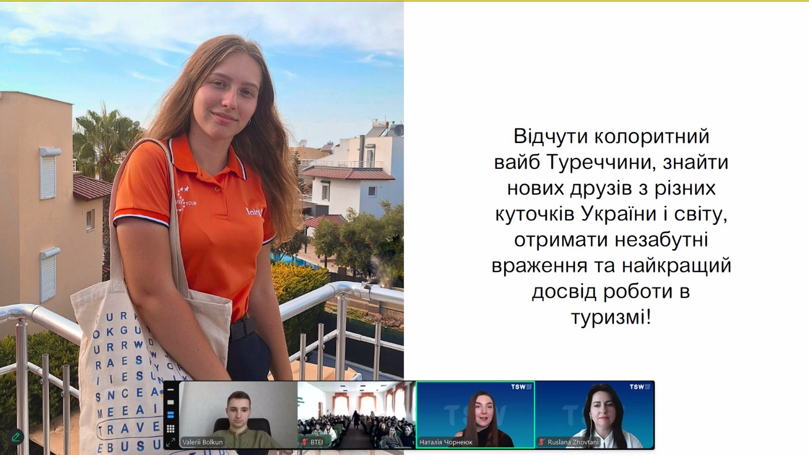 Під час зустрічі у змішаному форматі обговорювались можливості міжнародних пактик на літній сезон 2025 року. Учасники дізналися про міжнародні програми стажувань, перспективи сезонної практики в різних країнах світу, таких як Туреччина, Словаччина, Болгарія, Греція, Італія, Кіпр та ін. Студенти мали змогу задати питання щодо умов участі, вимог до кандидатів та особливості адаптації в іншій країні.