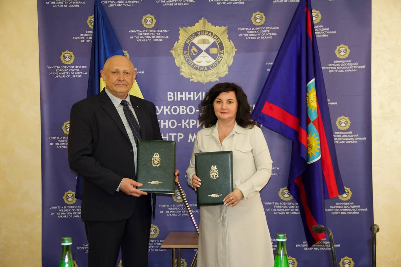 Під час засідання круглого столу відбулась урочиста церемонія підписання договору про партнерство і співпрацю між ВТЕІ ДТЕУ та НДЕКЦ МВС м. Вінниця. Зі сторони інституту договір підписала директор проф. Замкова Наталія, а зі сторони НДЕКЦ його директор Лайтер Микола.
