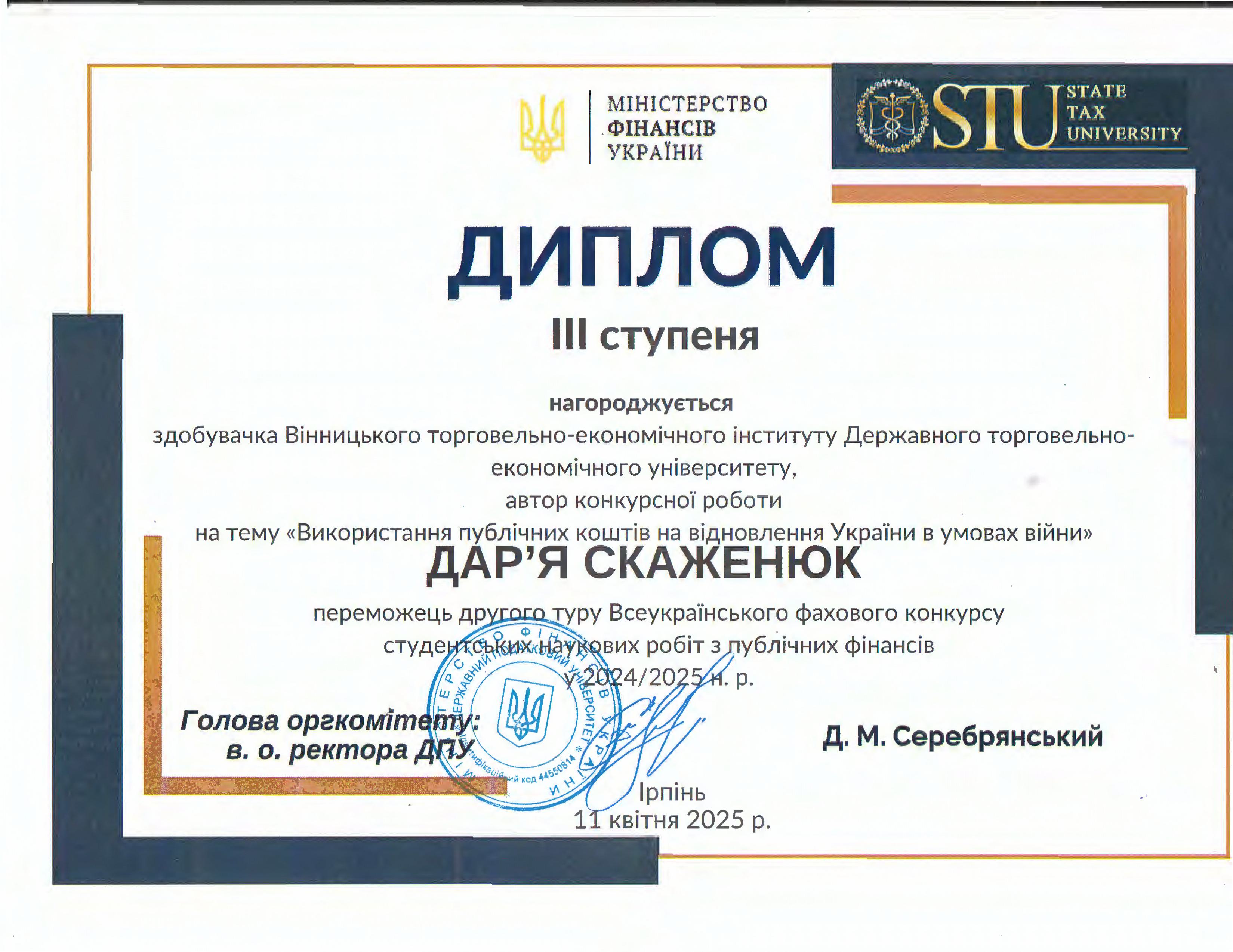 Студентка 2 курсу спеціальності 072 «Фінанси, банківська справа, страхування та фондовий ринок» Скаженюк Дарія вийшла у ІІ тур Всеукраїнського фахового конкурсу студентських наукових робіт з публічних фінансів, який проводився на базі Державного податкового університету (м. Ірпінь). 11 квітня 2025 року відбувся захист наукових робіт у формі науково-практичної конференції (в режимі онлайн-конференції на платформі ZOOM).