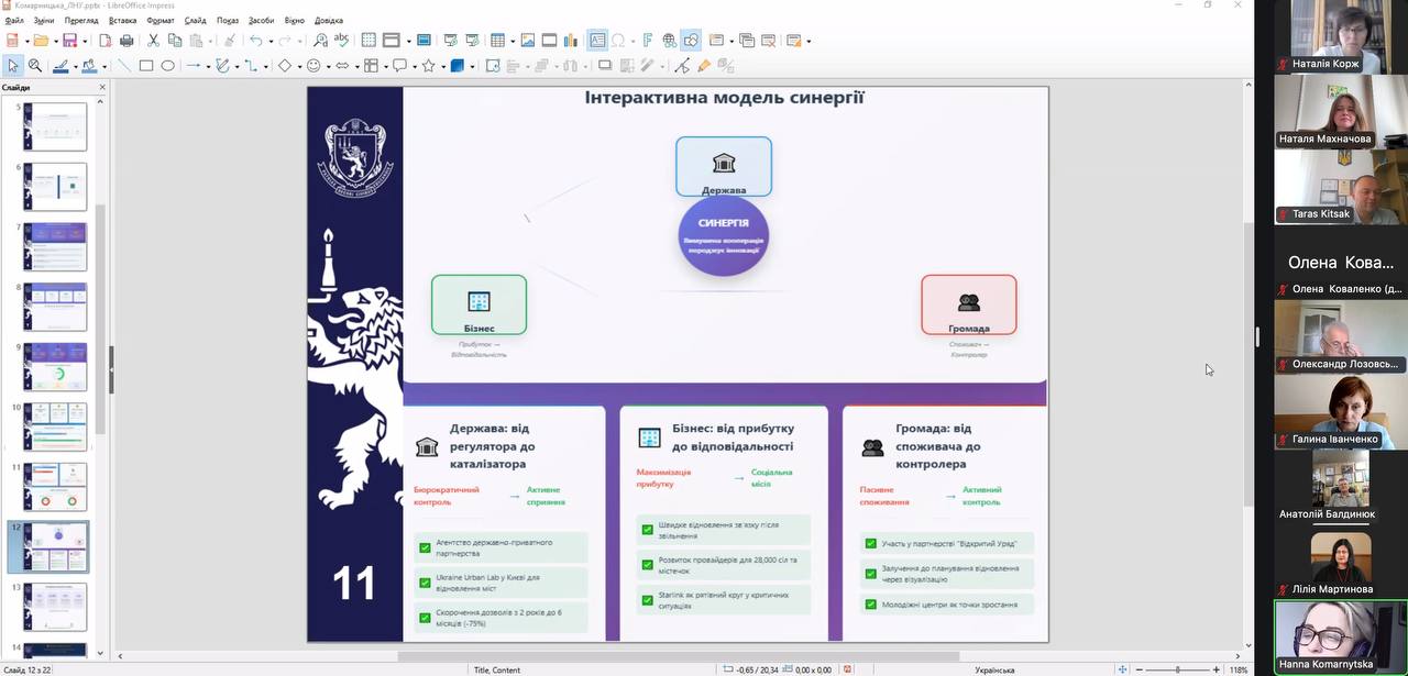 Своїм досвідом та напрацюваннями з учасниками круглого столу поділилися: - Ганна Комарницька, доктор економічних наук, професор, завідувачка кафедри публічного адміністрування та управління бізнесом Львівського національного університету імені Івана Франка, доповідь «Формування майбутнього через синергію держави, бізнесу та громади»