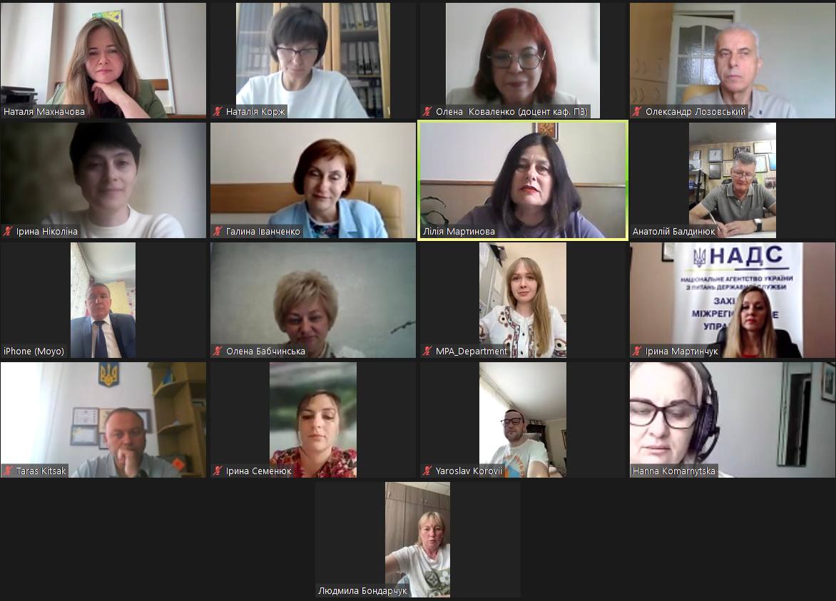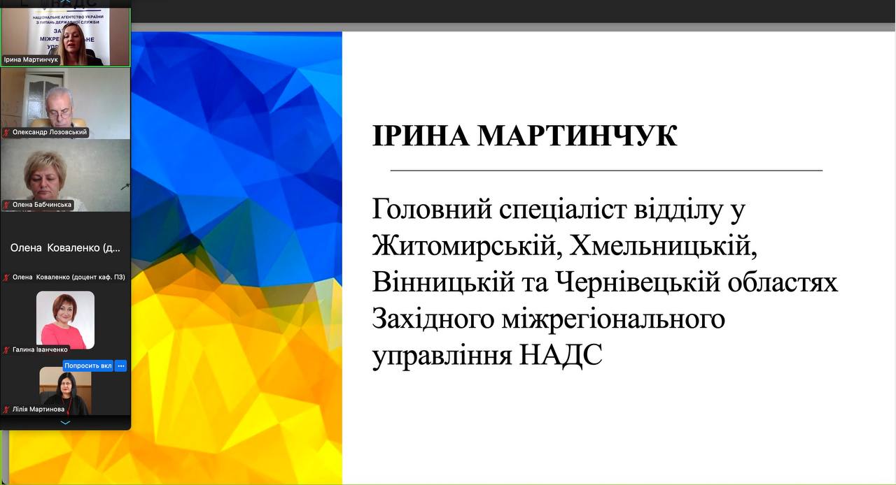 - Ірина Мартинчук, головний спеціаліст відділу у Житомирській, Хмельницькій, Вінницькій та Чернівецькій областях Західного міжрегіонального управління НАДС, доповідь «Зміцнення спроможності системи публічного управління в умовах воєнного стану»