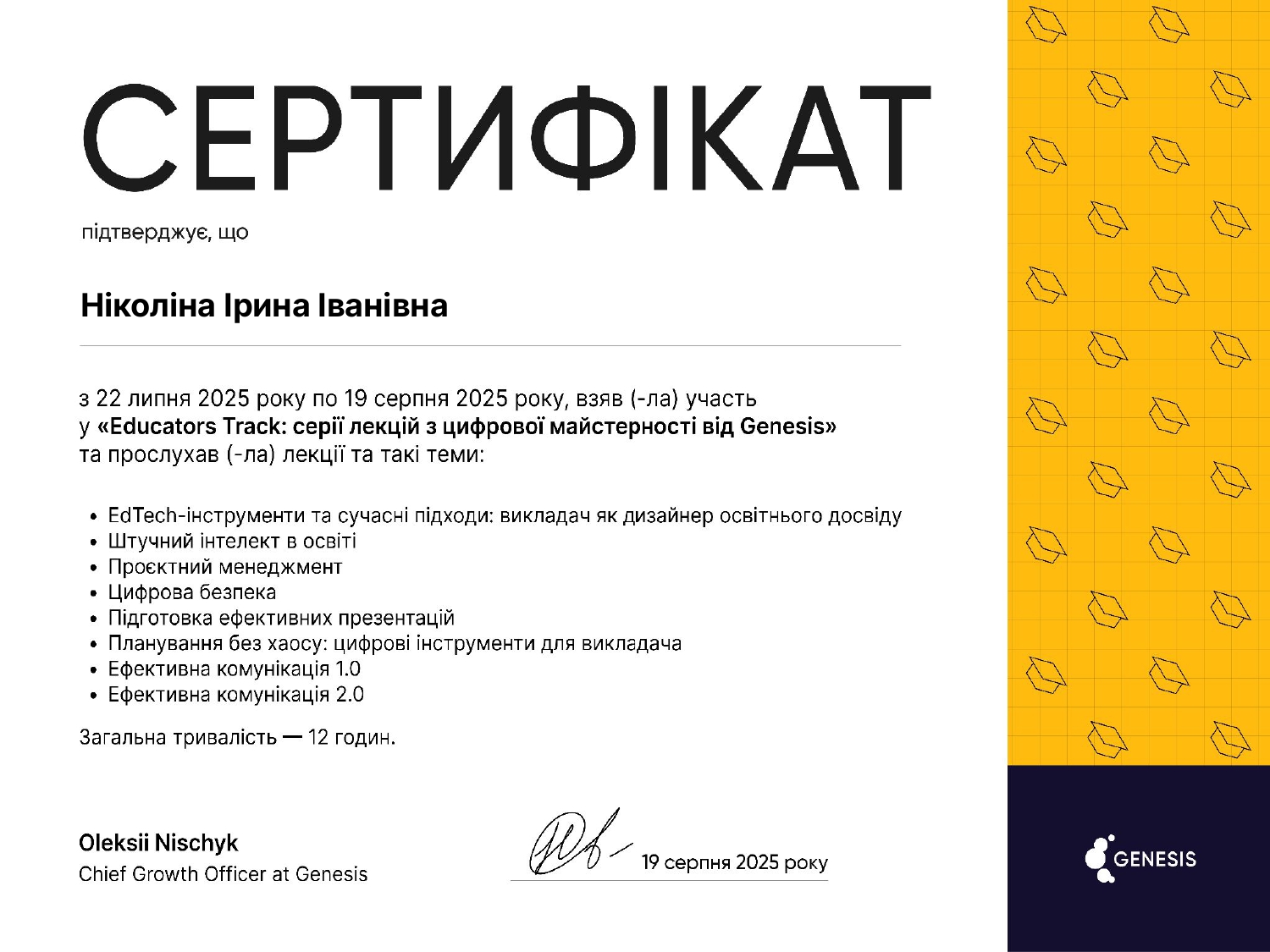 Впродовж 22.07-19.08 2025 р. викладачі кафедри менеджменту та публічного управління к. е. н., доцент, декан ФЕМП Галина Іванченко та к. н. держ. упр., доцент Ірина Ніколіна взяли участь в «Educators Track: серії лекцій з цифрової майстерності від Genesis», який був проведений у вигляді вебінарів за тематикою: «dTech-інструменти та сучасні підходи: викладач як дизайнер освітнього досвіду», «Штучний інтелект в освіті», «Проєктний менеджмент», «Підготовка ефективних презентацій», «Цифрова безпека», «Планування без хаосу: цифрові інструменти для викладача», «Ефективна комунікація». Здобуті в ході навчання компетентності дозволять поглибити використання цифрових інструментів в освітньому процесі ВТЕІ.